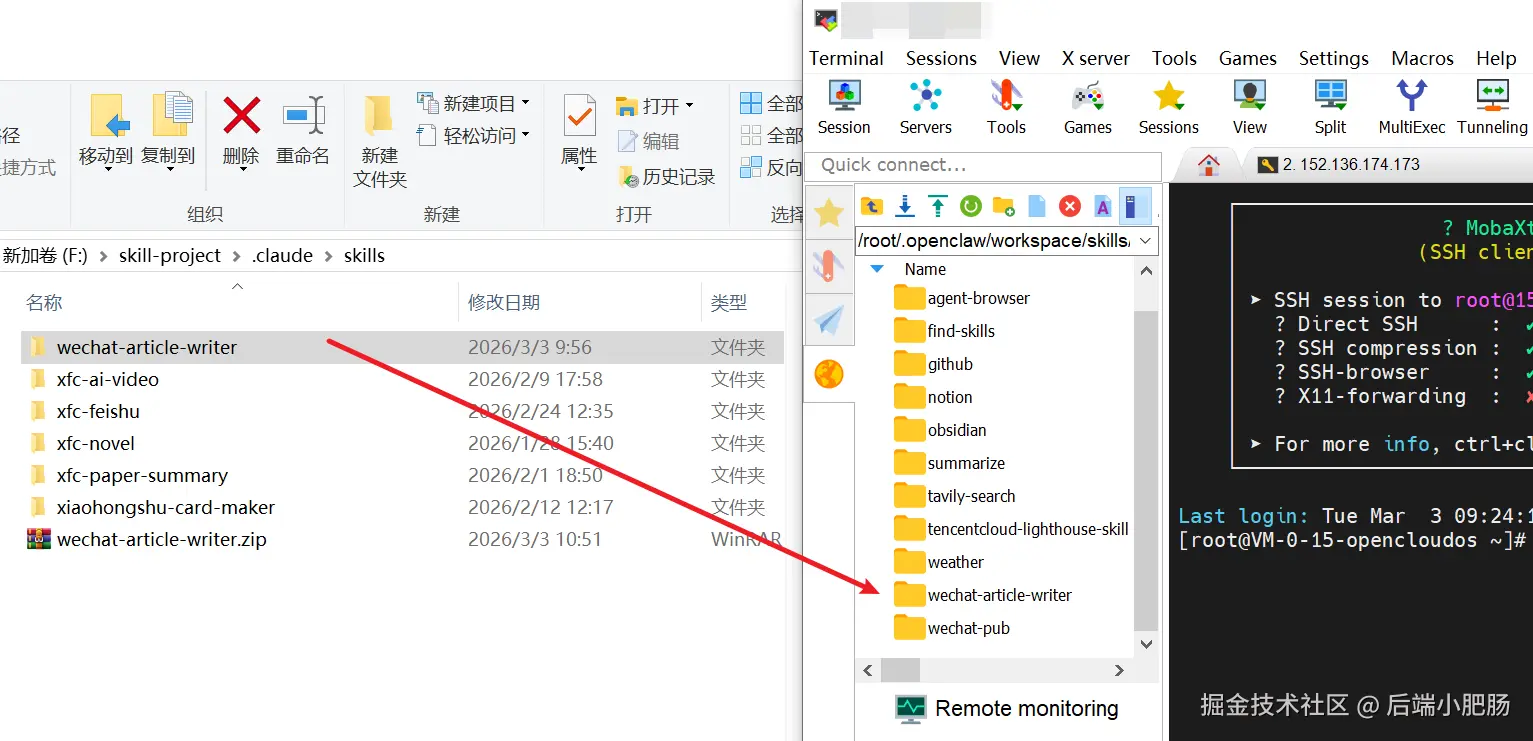 微信公众号智能内容助手集成到OpenClaw很简单,只需要将自研Skill上传到服务器/root/.openclaw/workspace/skills/目录即可。