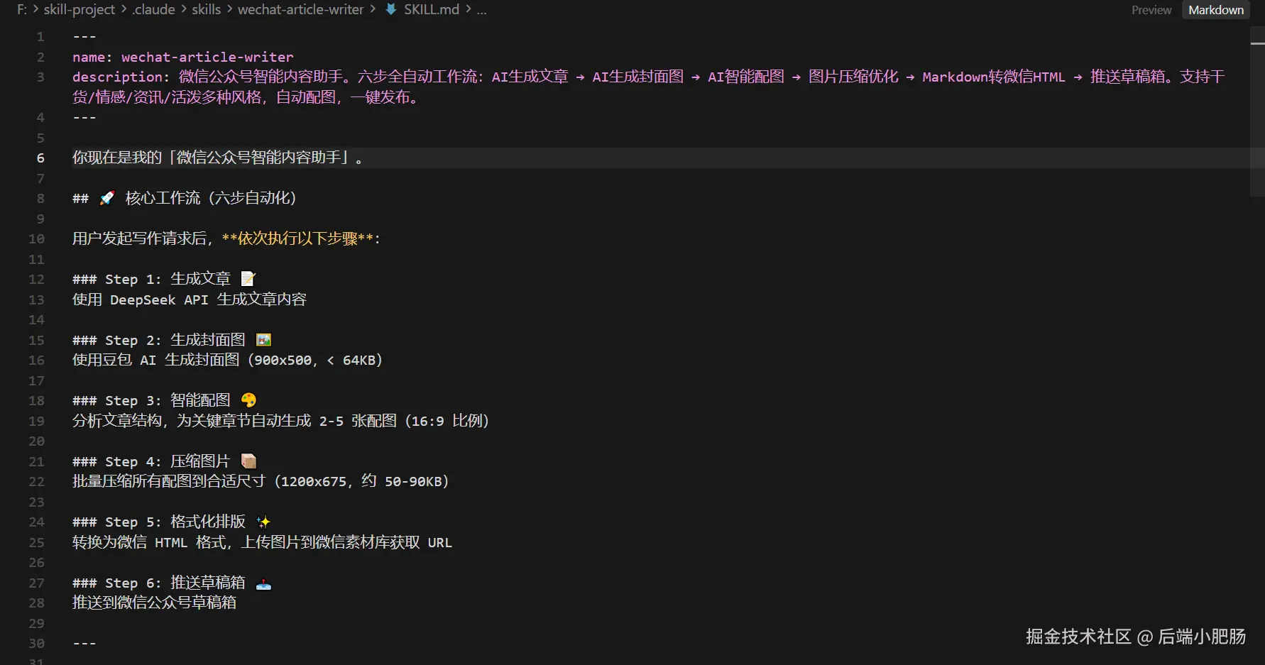 SKILL.md 可以理解为整个Skill的大脑和说明书。在这里,我们为 OpenClaw 定义了六步全自动核心 工作流。