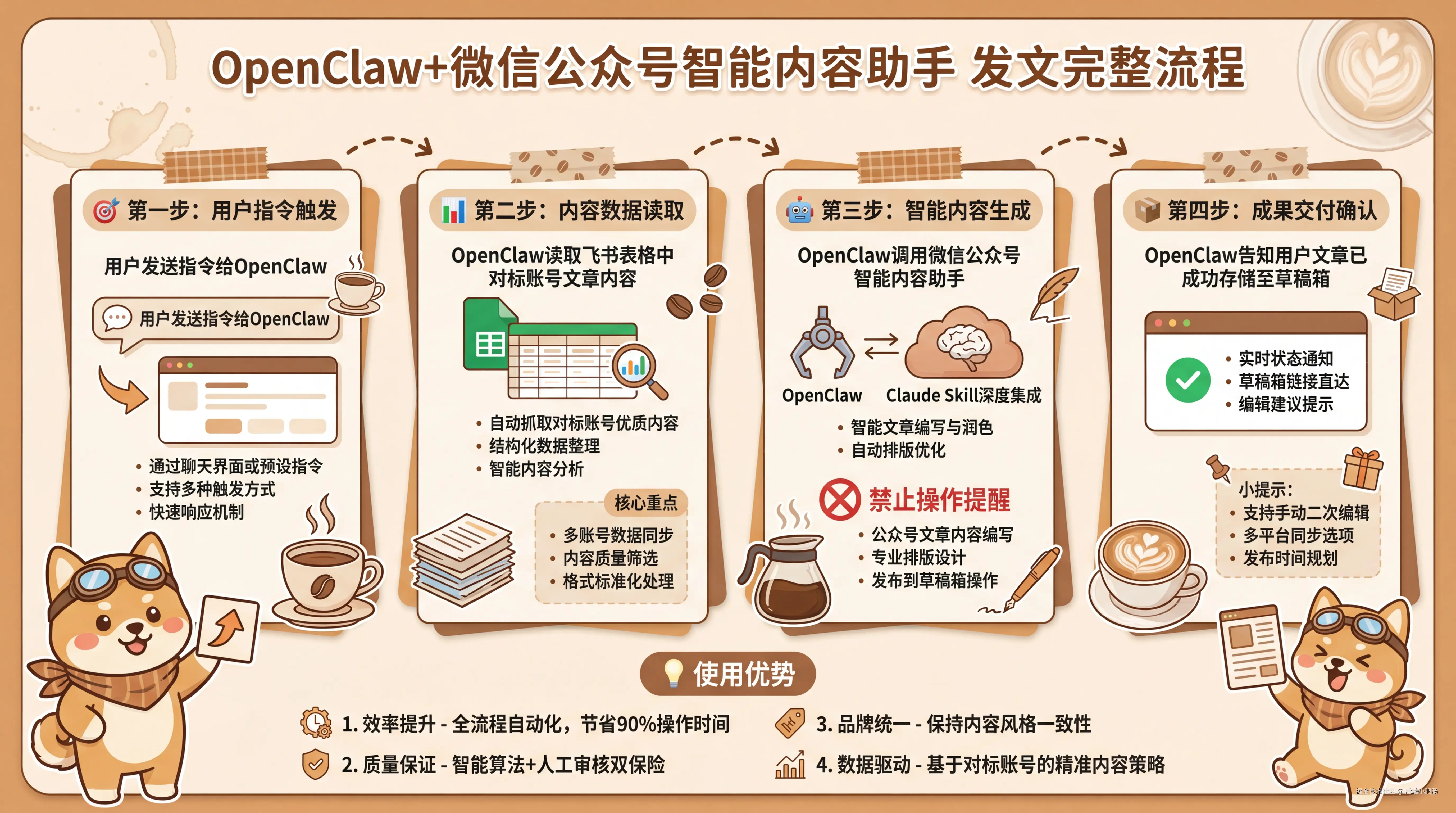 从最初的手动排版,到后来用 Coze、n8n 折腾半自动化,再到今天用 OpenClaw + Claude Skills 跑通这条全自动的生文-生图-排版-发布闭环,我们见证了 AI 工具的飞速进化。在这个过程中,我们最大的收获不只是写出了几行代码,而是将自己从繁琐的机械劳动中解放了出来。