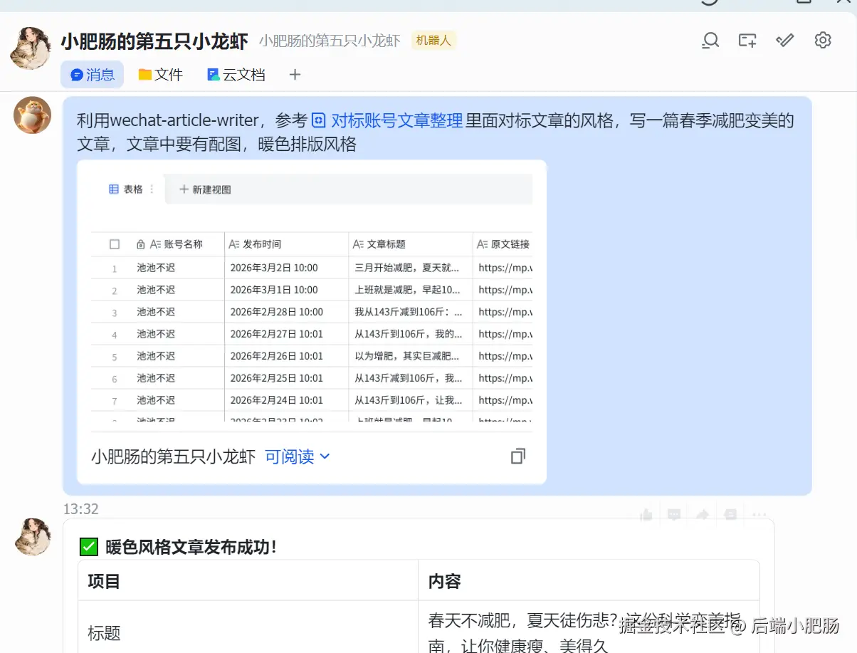 话不多说直接给大家看一下今天工具的效果,只需要向飞书发送一句话:参考[对标文章多维表格]里面对标文章的风格,写一篇春季减肥变美的文章,文章中要有配图。