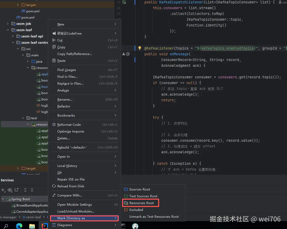 右击 Resouces 文件夹,如果是 test 包下的就选择 Test Resource Root,如果不是就选择 Resource Root