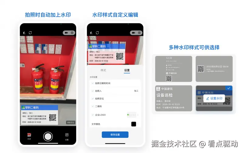 打开就拍,拍完照片上会自动叠加关键现场信息,比如时间、定位、操作人等。水印字段和展示样式支持按业务需要调整,也可以放企业 logo。