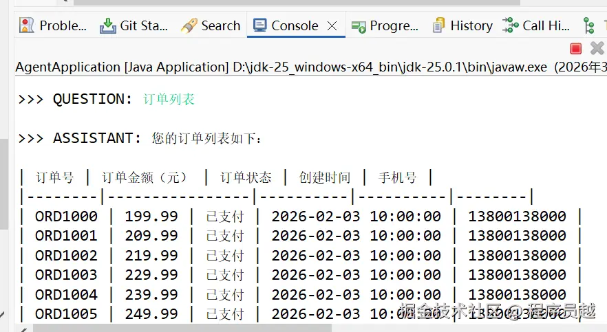 测试服务调用与负载均衡:在Agent控制台输入相关问题(如“获取订单详情”“获取订单列表”),Agent会自动调用MCP服务,返回处理结果;多次输入相同指令,可通过Nacos控制台或服务日志,观察请求是否在两个MCP实例间均衡分发,验证负载均衡效果。
