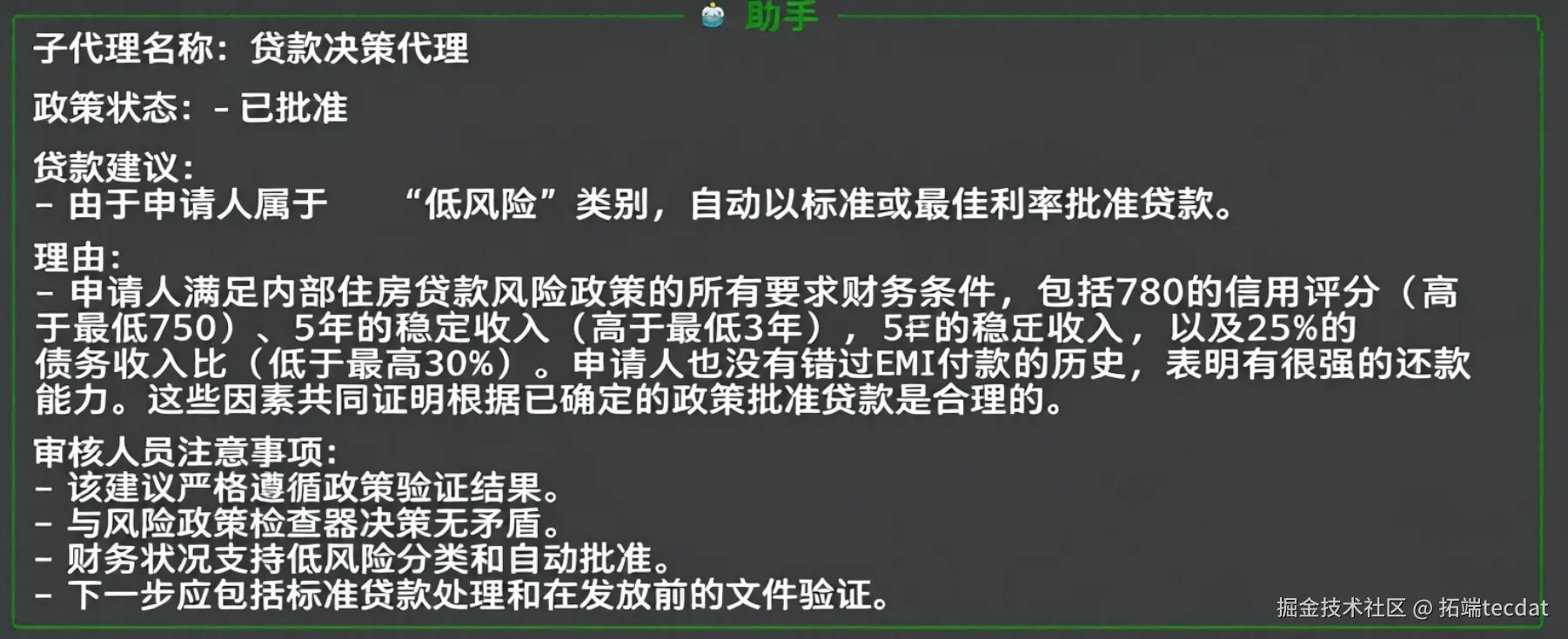 信贷决策智能体输出:根据低风险类别,建议自动批准。