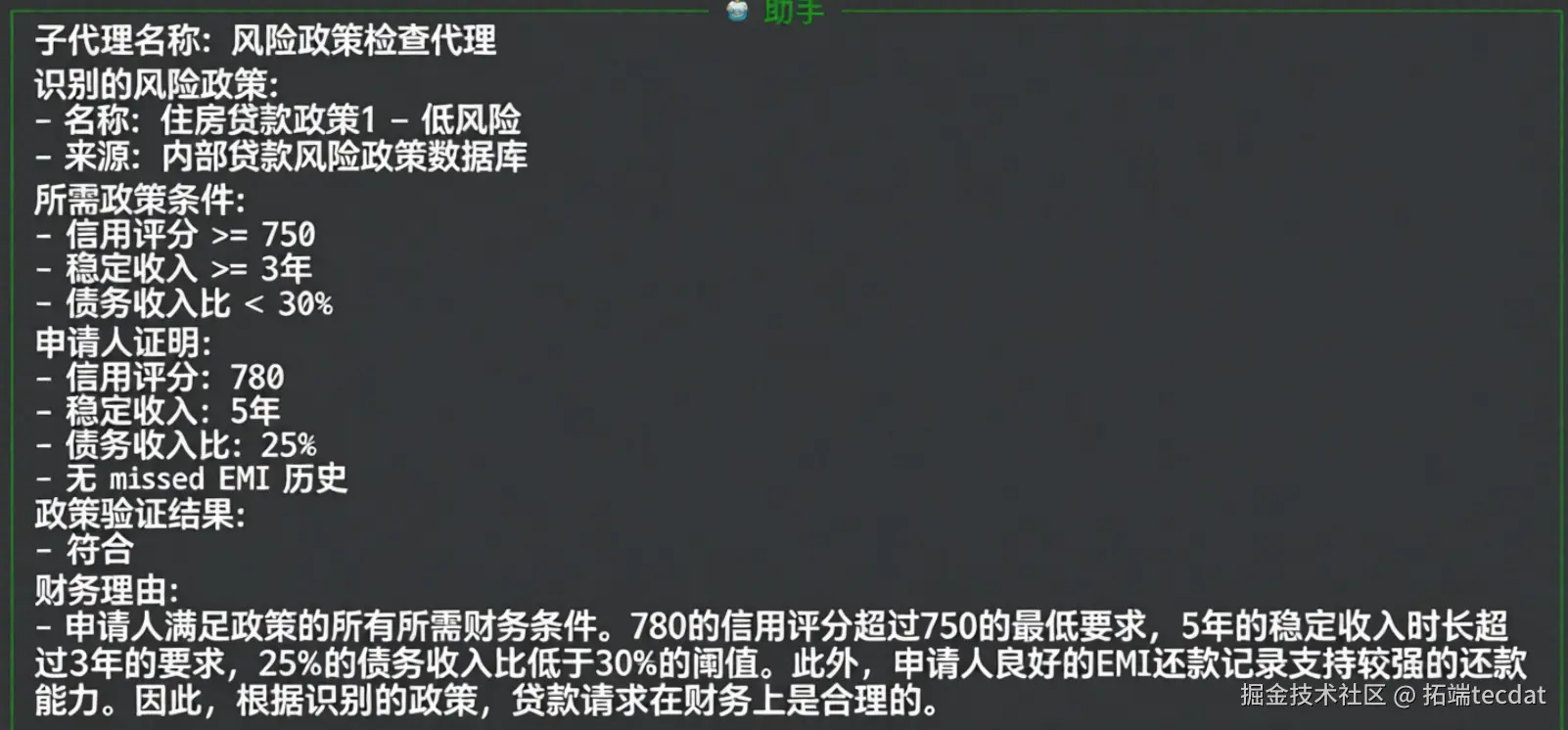 - 风险政策核对智能体:分析师,将申请人信息与预设的信贷标准进行匹配。