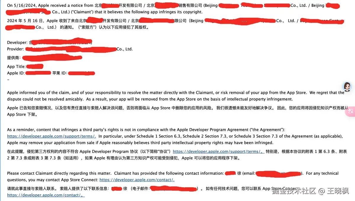 2025年2月5号app就突然被下架了,然后翻了下邮件在当天苹果发了一份邮件