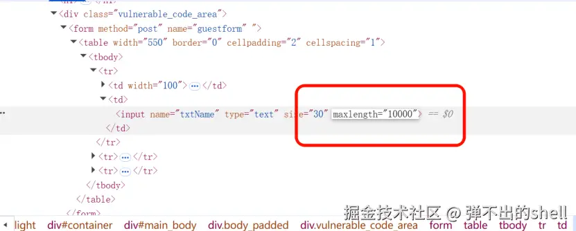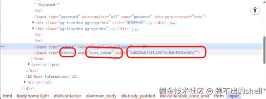 username、password、user_token三个核心参数,token 为32位随机字符串。 - 定位token:查看前端页面源码,token 藏在