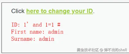 1' order by 2 #,正常返回;输入1' order by 3 #,报错,说明查询结果为2列。 - 联合注入提取数据: