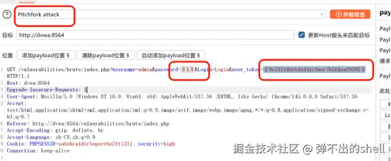 Intruder,选择Pitchfork 交叉爆破,标记password和user_token为爆破位置; - 进入