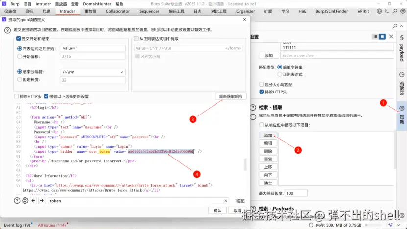 <input type="hidden" name="user_token" value="xxx">中,可通过正则匹配提取。 - Burp 配置