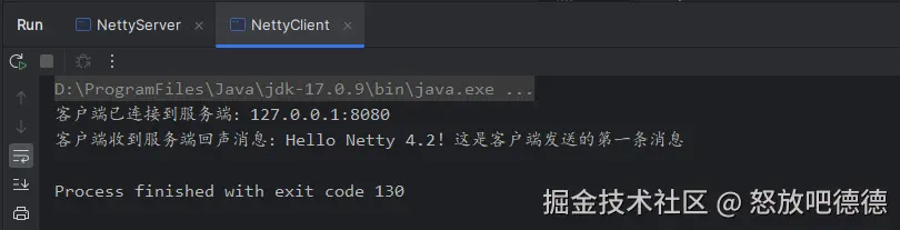 - 查看客户端控制台,会输出“客户端收到服务端回声消息:Hello Netty 4.2!这是客户端发送的第一条消息”,表示回声服务正常运行。