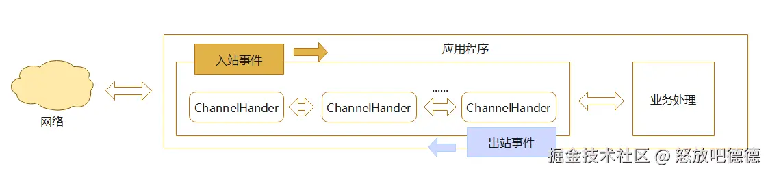 - ChannelHandler,分别定义了处理入站(Inbound,数据从远端到本地)和出站(Outbound,数据从本地到远端)事件的方法。