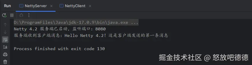 - 查看服务端控制台,会输出“服务端收到客户端消息:Hello Netty 4.2!这是客户端发送的第一条消息”;