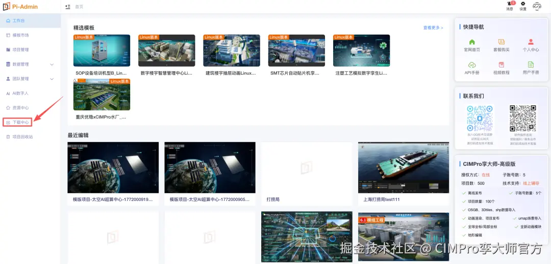 启动CIMPro后,点击“新建项目”,在模板库中筛选“智慧水利”、“数字孪生水库”或“水电站”等分类。