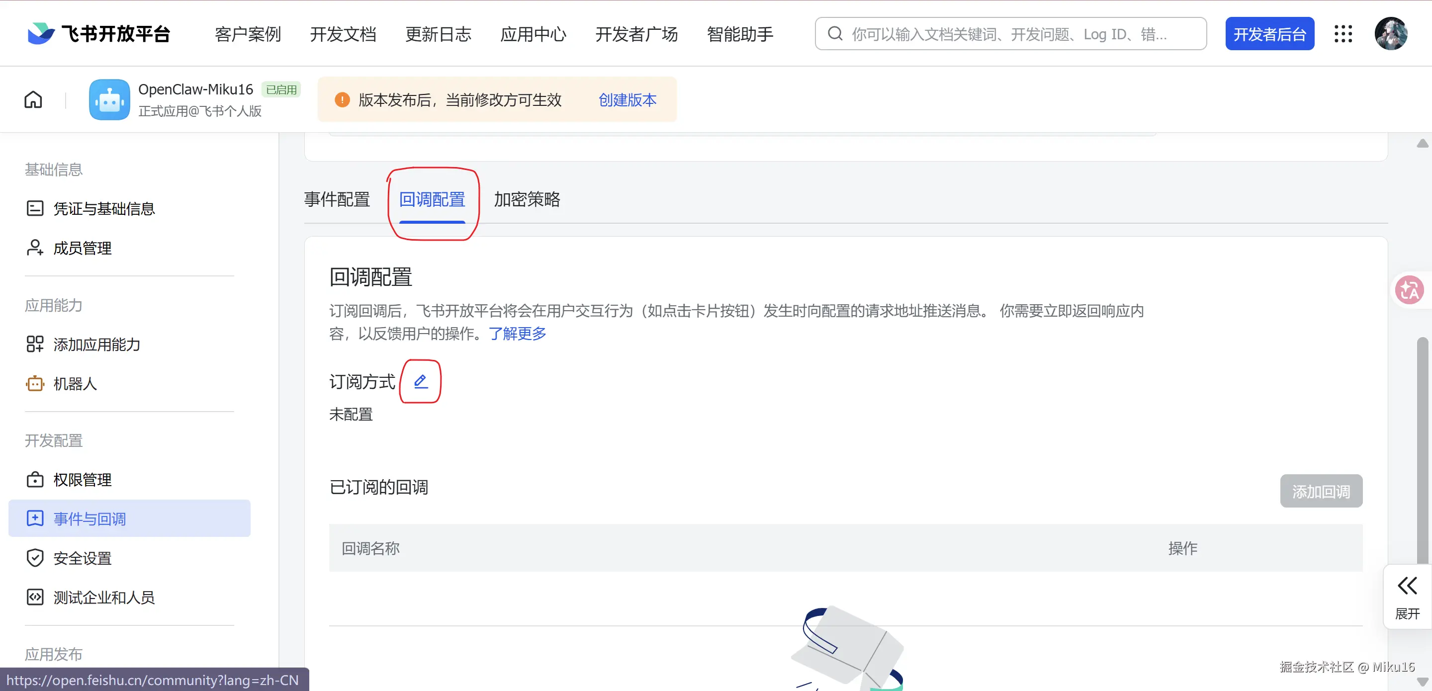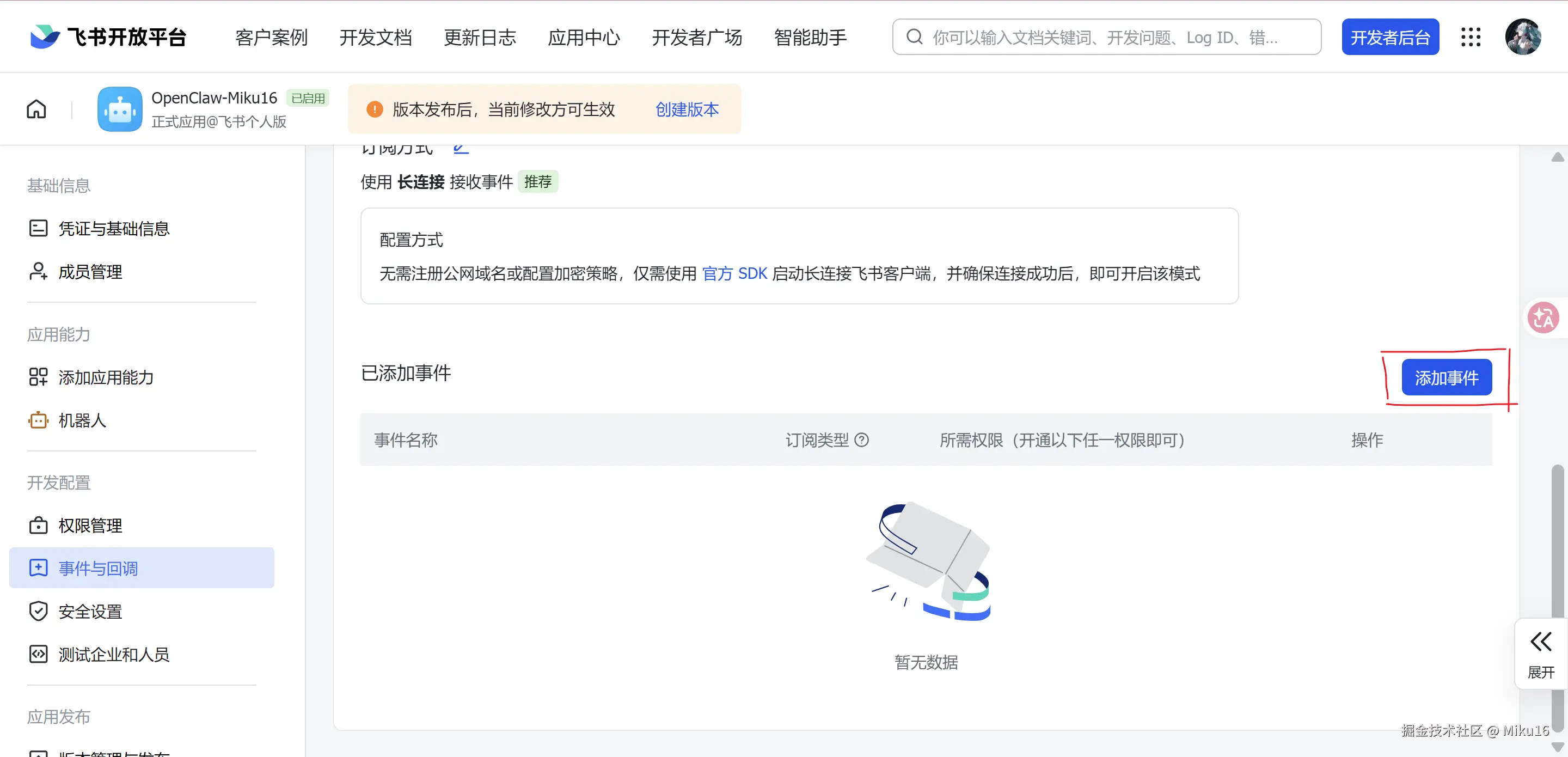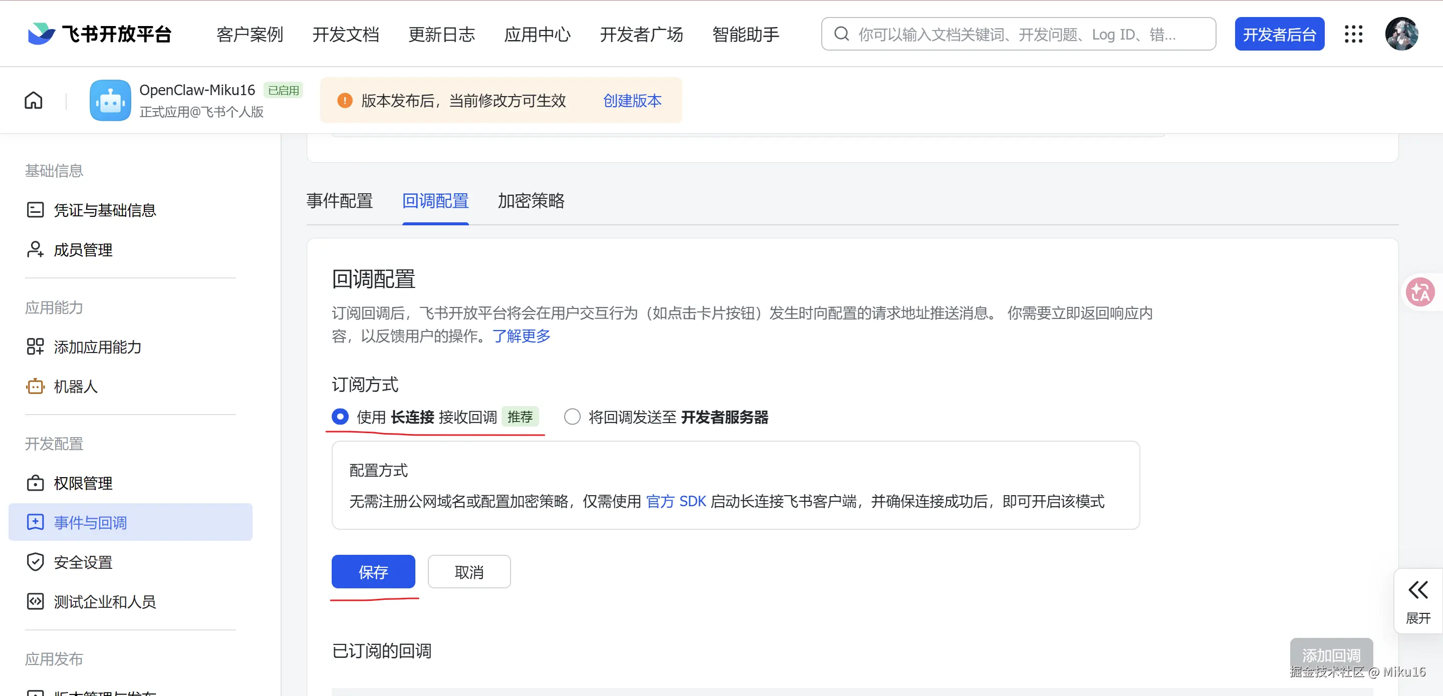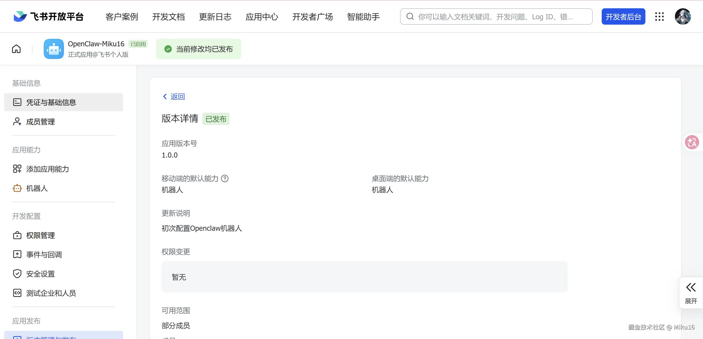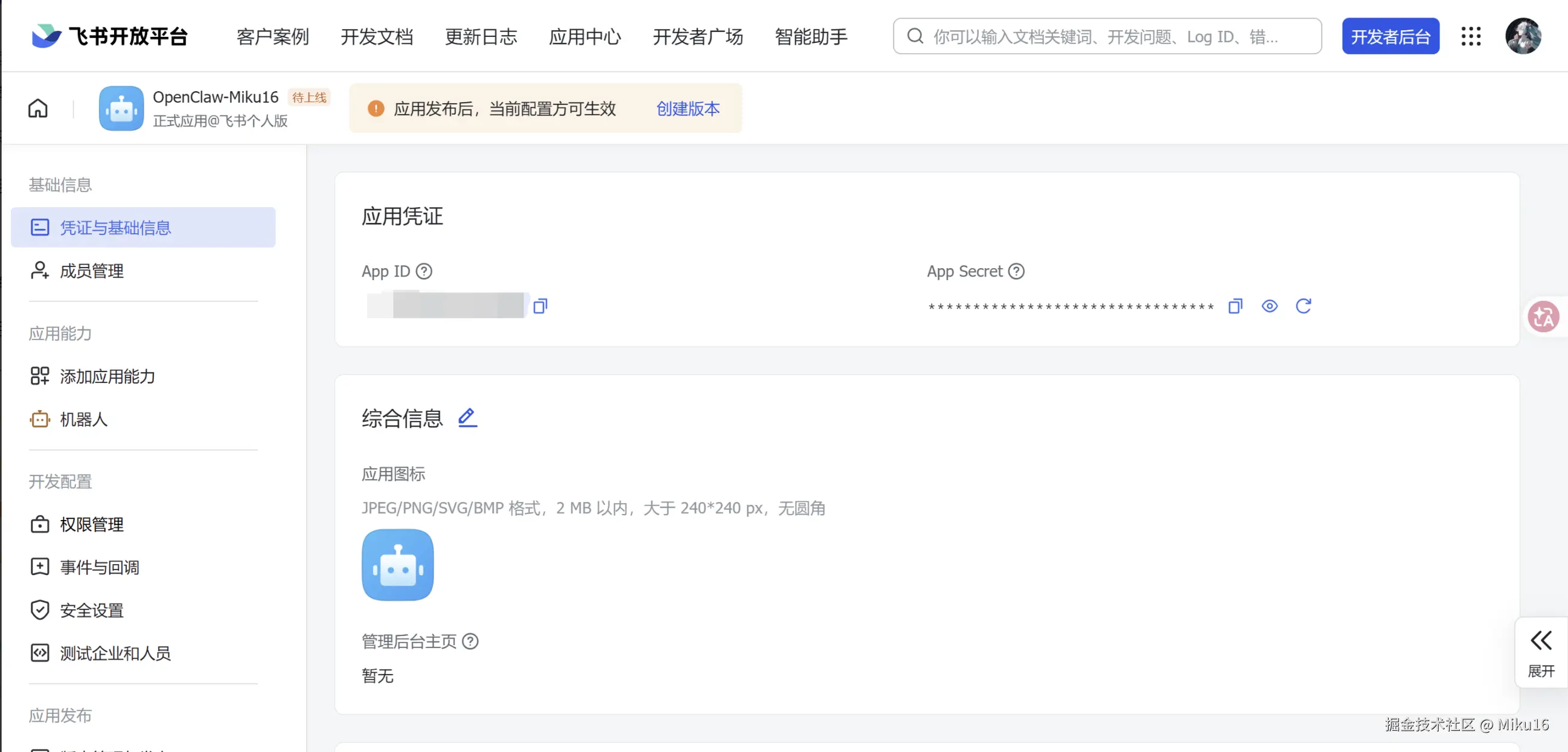 成功发布修改。将该飞书机器人的APP ID和App Secret,填写到OpenClaw的飞书集成配置中。