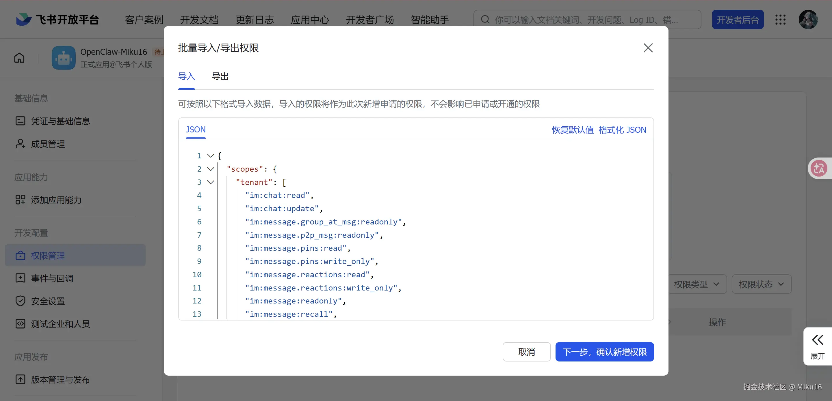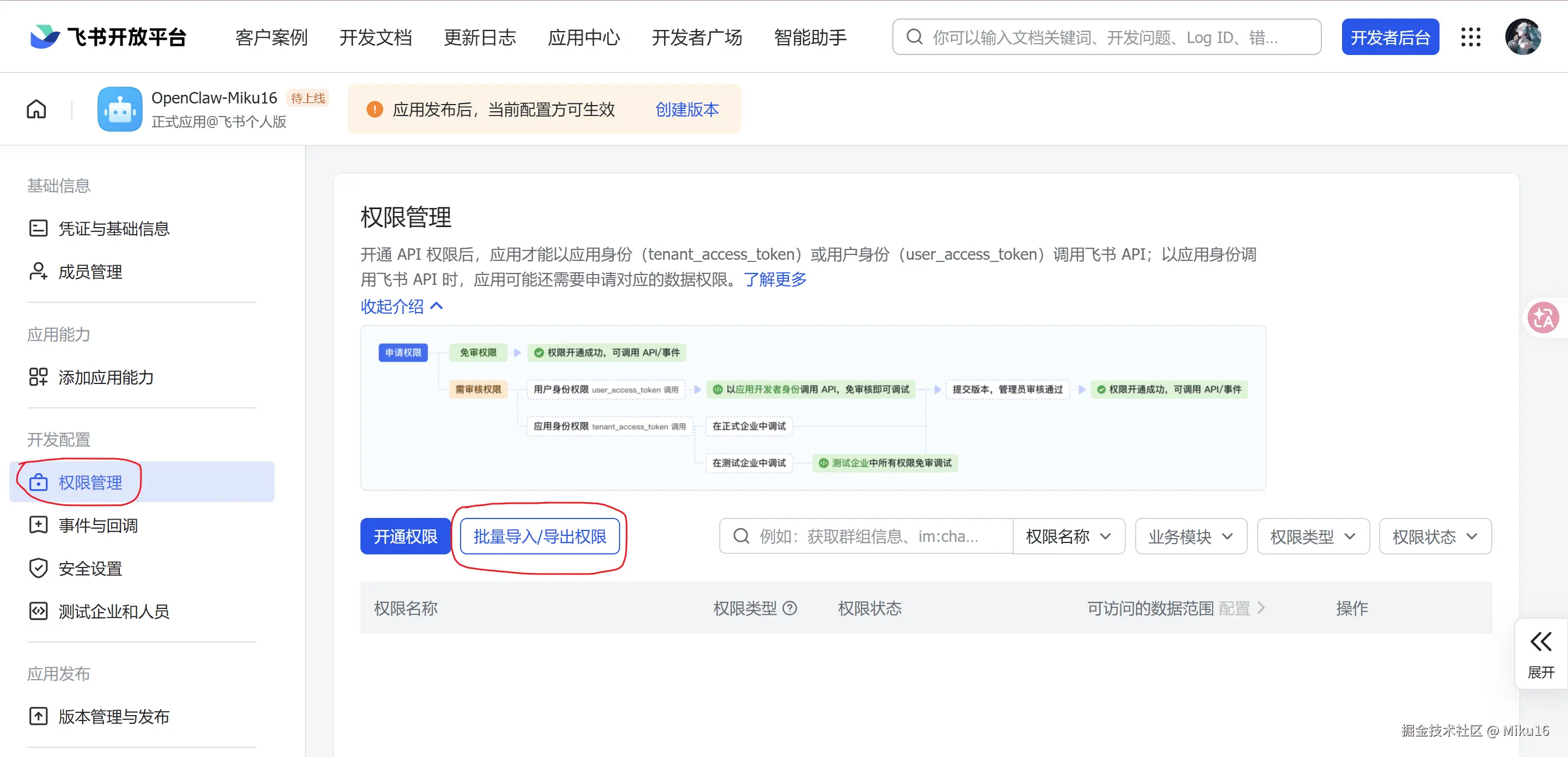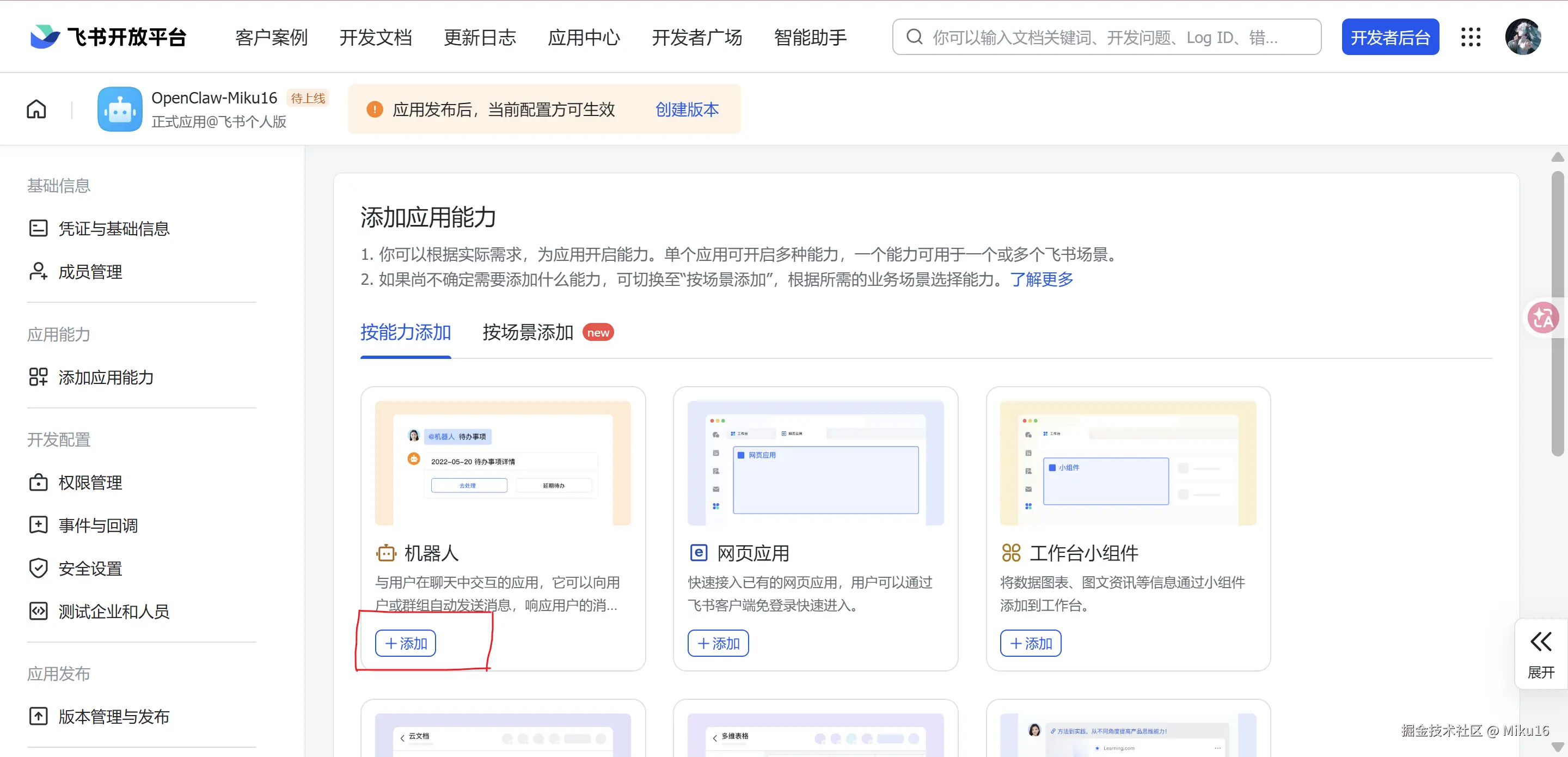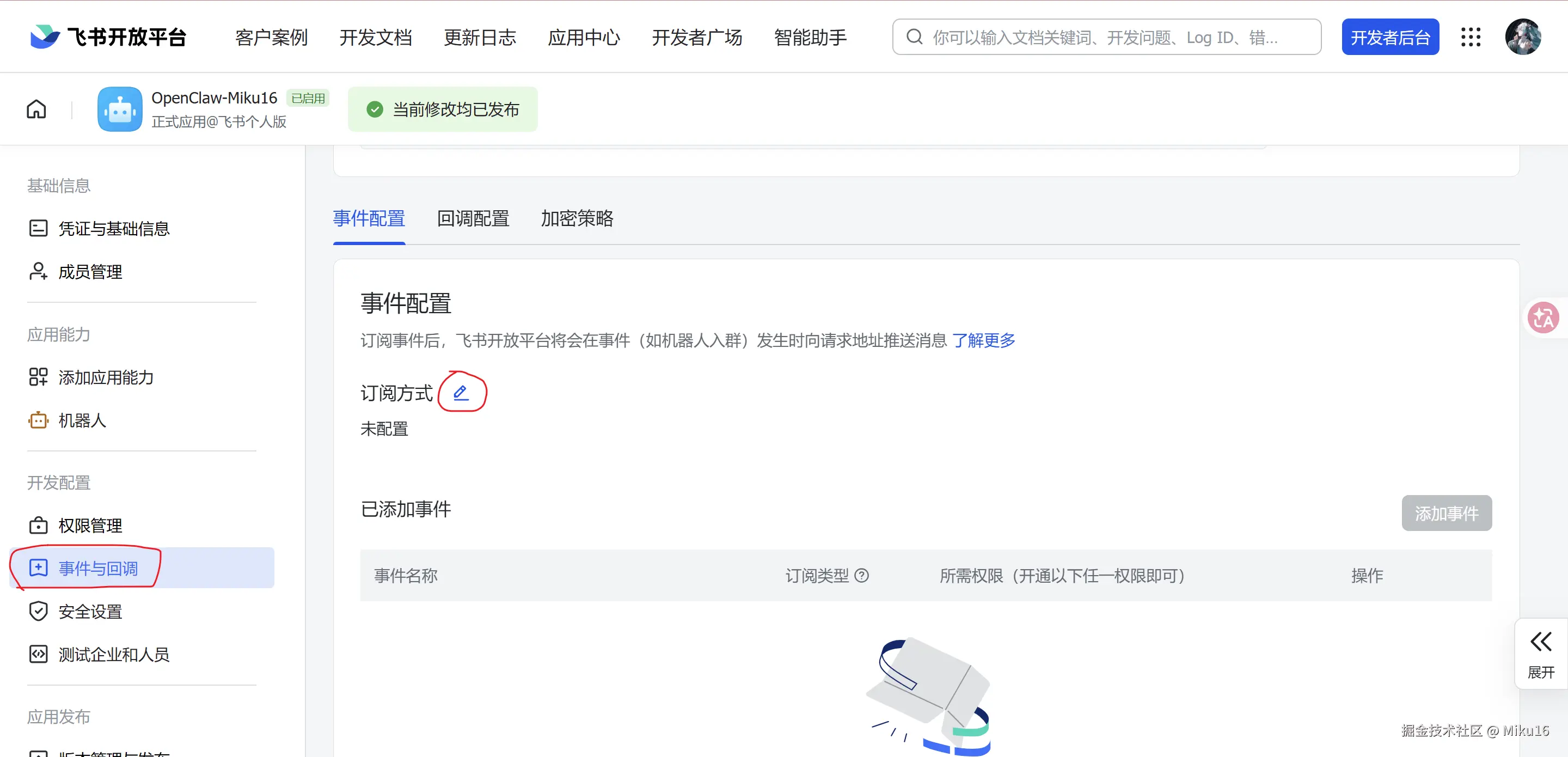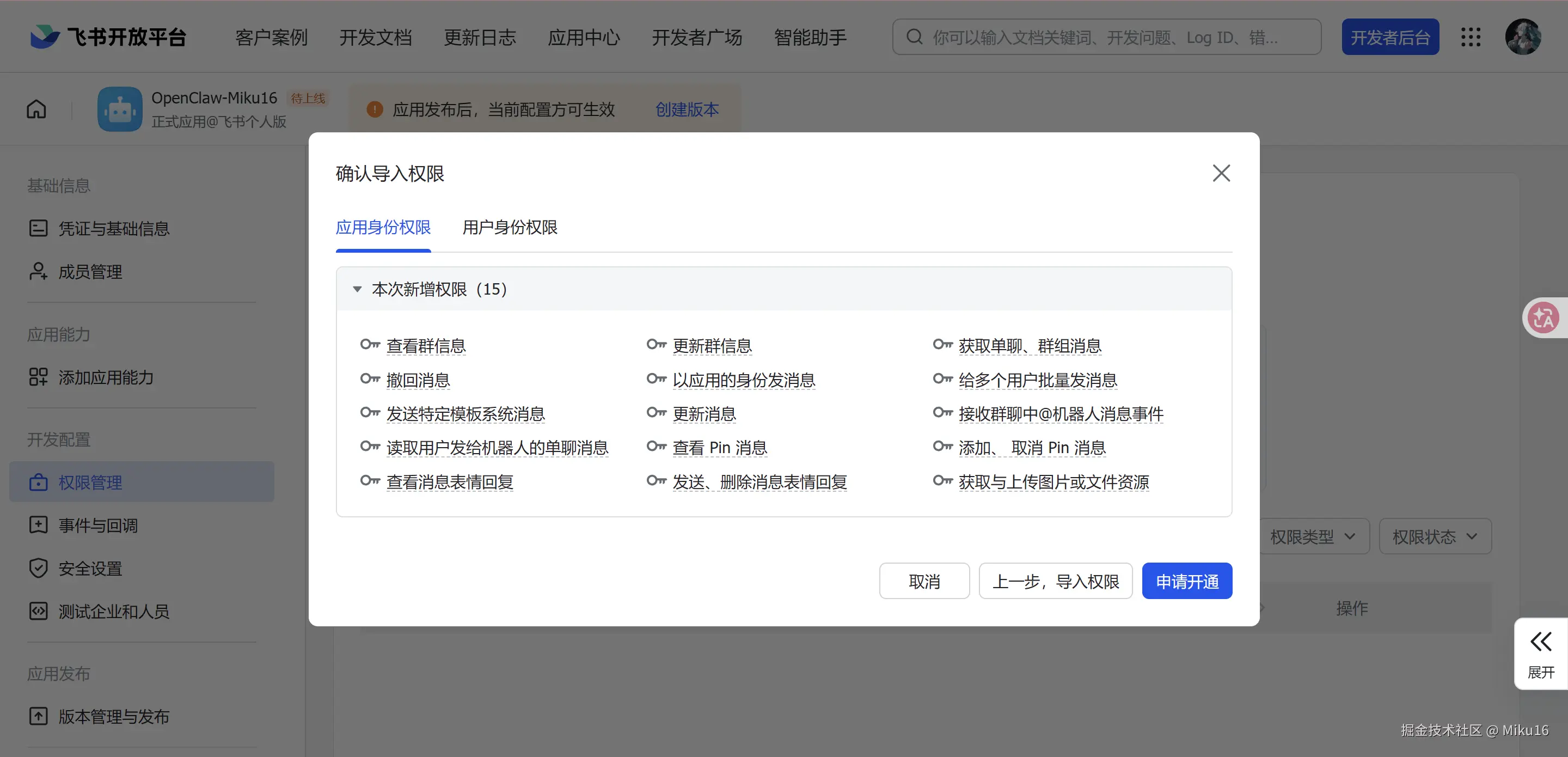 成功发布修改。将该飞书机器人的APP ID和App Secret,填写到OpenClaw的飞书集成配置中。