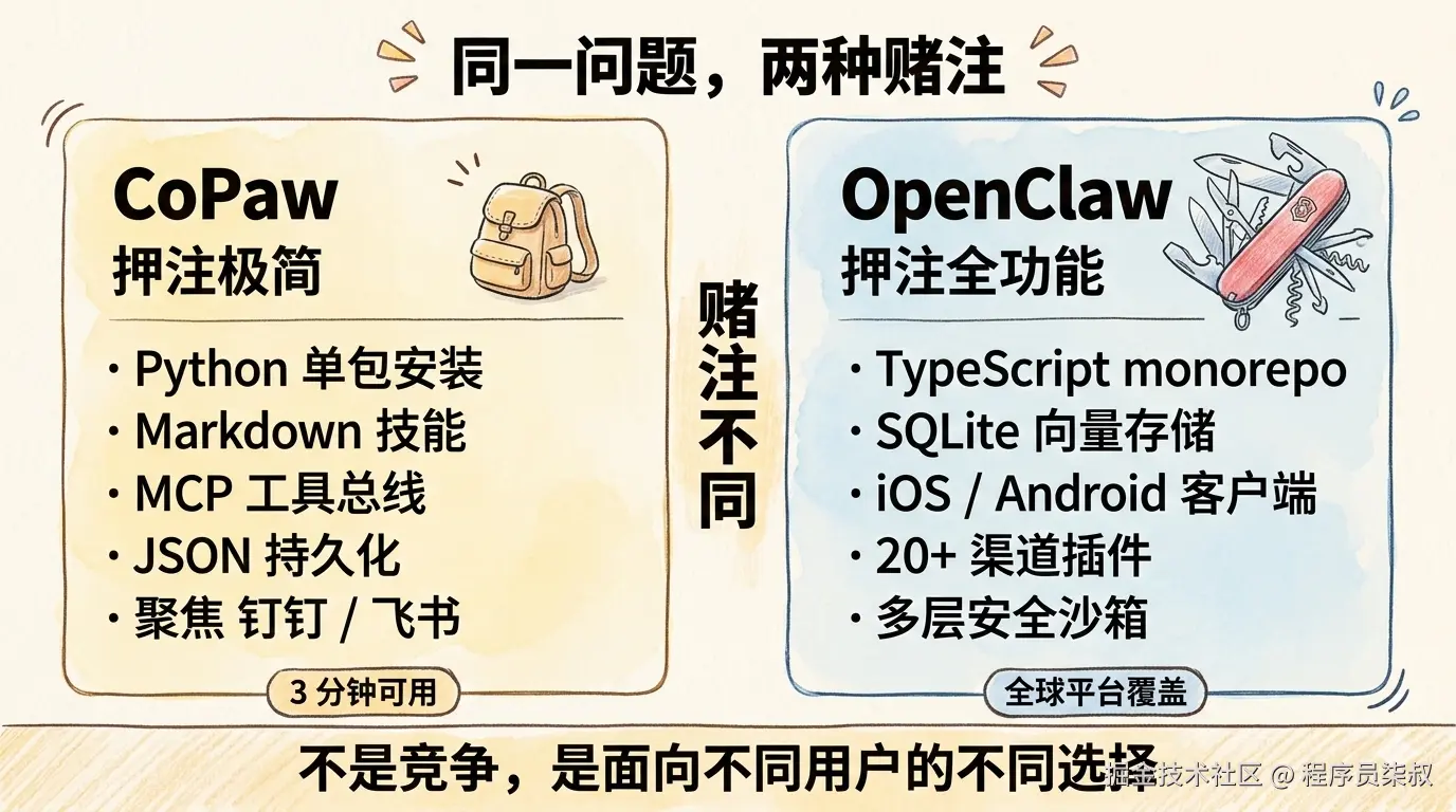 这条路不是没有人走。同期有 OpenClaw(TypeScript/Node.js 实现,20+ 渠道,配套 iOS/Android 原生客户端),走的也是本地优先路线,但体量和复杂度都大了不止一个量级。CoPaw 和 OpenClaw 代表的是同一个问题空间里两种截然不同的解法——本文后半段会详细对比。