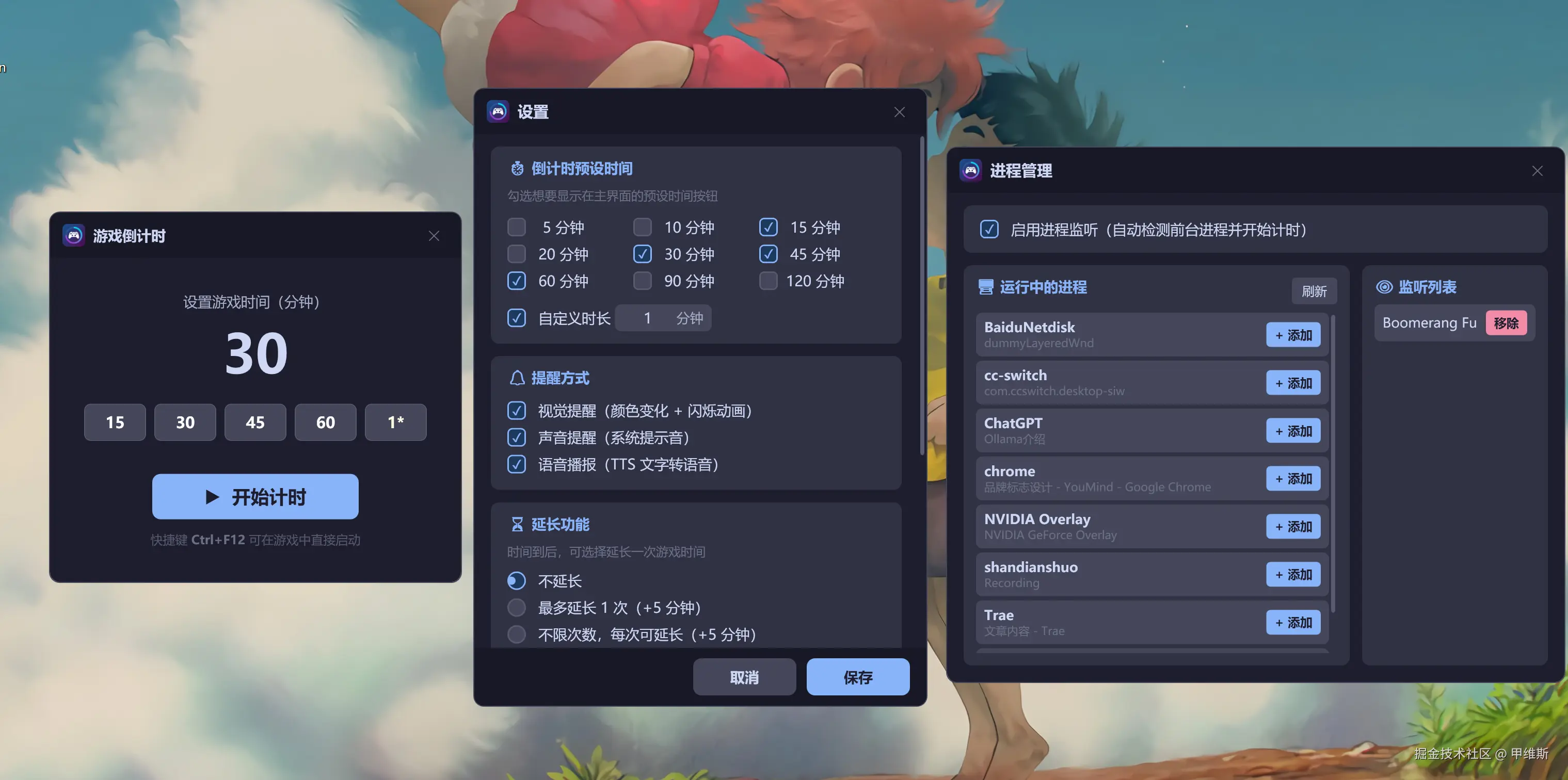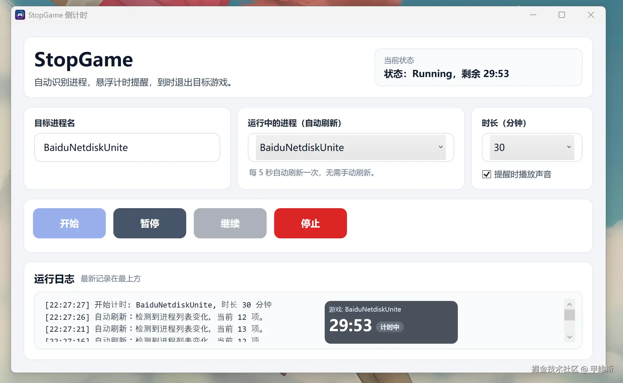 Gemini3.1Pro这一次智商在线,设计的还不错。完成度很高! 它也是选择了进程这种方式。但是它可以做到很智能的控制。游戏启动自动计时,游戏切出来自动停止。
