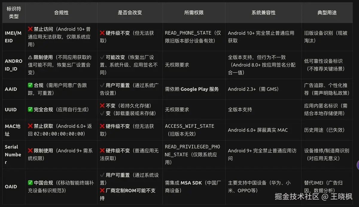 **安卓的MAC地址、IMEI/MEID自从《个人信息保护法》发布和隐私合规限制,也不允许使用了;
