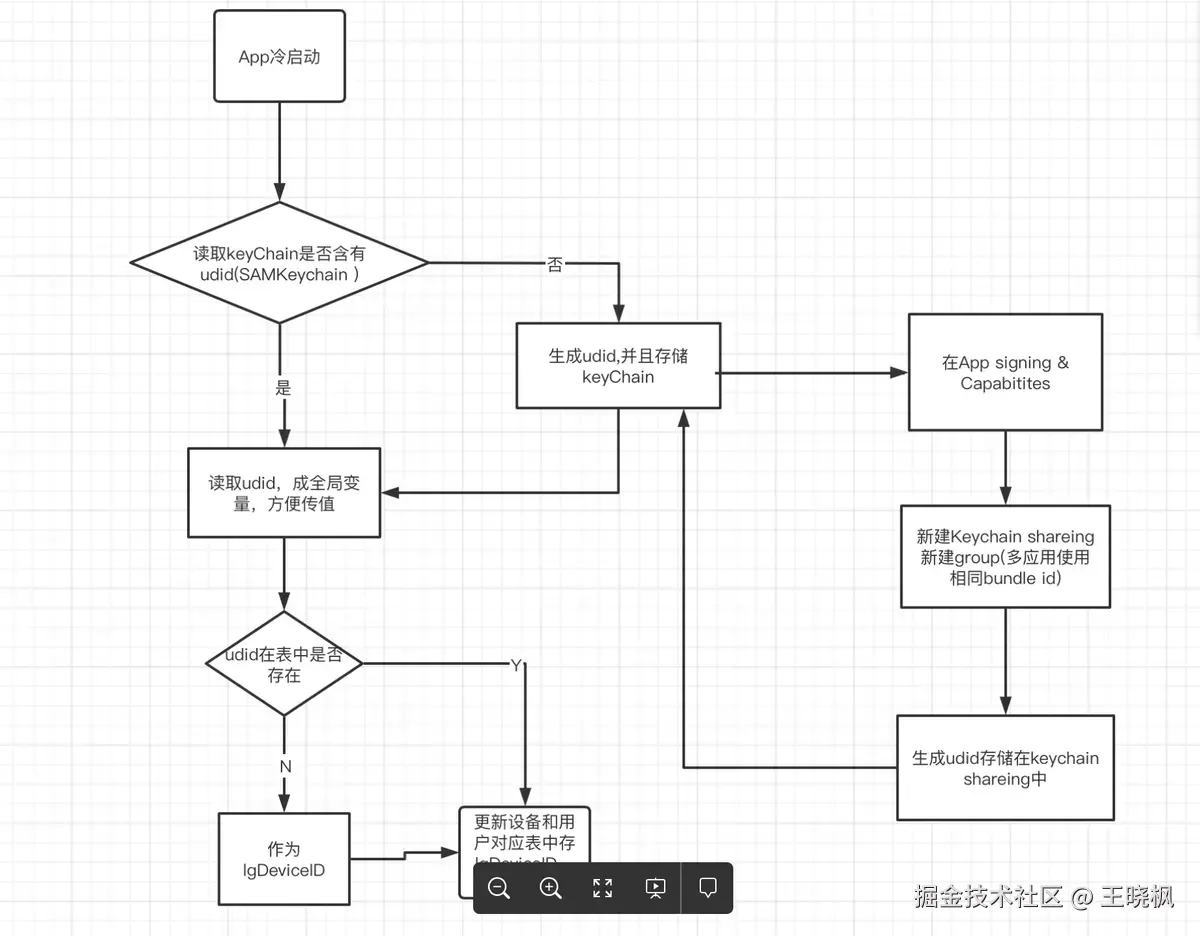我们想到可以使用UUID/IDFV生产一个临时的id,然后将其存储到系统的钥匙串中,在使用的时候从钥匙串中取值这样就能保持不同APP之间的设备ID唯一,同时不管APP卸载还是重启设备ID都不会变化。