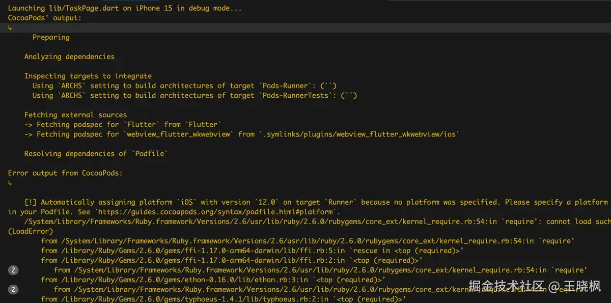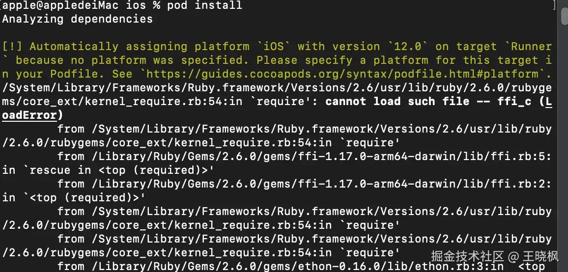 如是我们打开控制台cd 到项目的iOS目录,执行pod install这时候我们能看到控制台提示:- /Library/Ruby/Gems/2.6.0/gems/ffi-1.17.0-arm64-darwin/lib/2.6/ffi_c.bundle (LoadError)