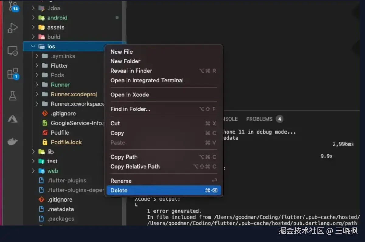 看问题时iOS的cocoapod在执行pod install命令下载第三方库时出现问题,如是我们找到项目中ios目录,使用xcode打开项目看看情况,