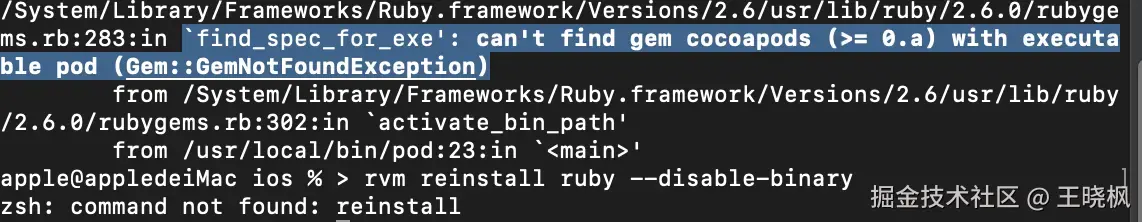 执行完成后再次执行pod install 报错: `find_spec_for_exe':can't find gem cocoapods (>= 0.a) with executable pod (Gem::GemNotFoundException)