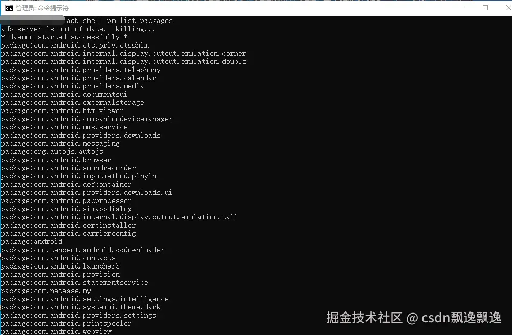 这是电脑cmd中调用adb shell命令查看雷电模拟器应用信息的情况,大家会发现,每次执行abd shell命令都会重启adb,因为我电脑上拥有adb的应用(Android Studio、按键精灵手机助手、雷电模拟器4、雷电模拟器9)太多了,出现这种情况主要是abd版本冲突导致的。幸好不影响功能,我这里就处理了,大家知道就好了。
