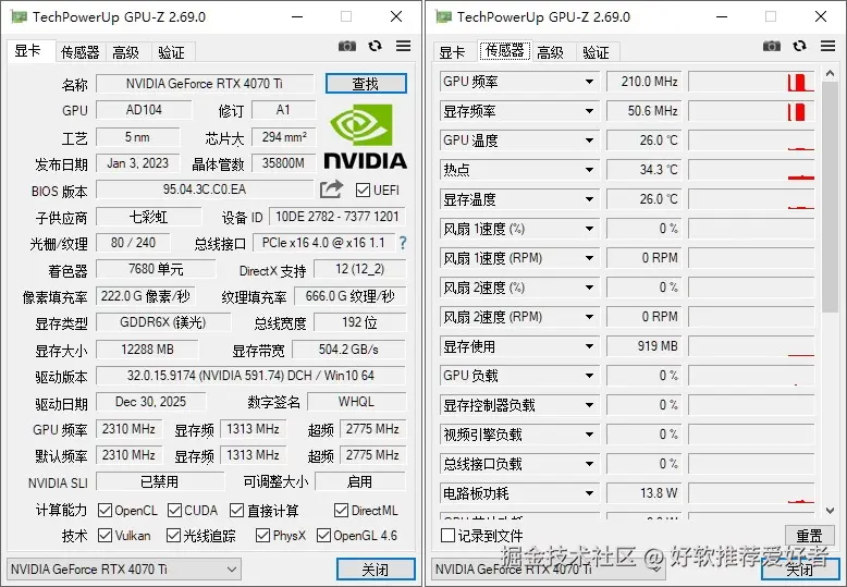以 NVIDIA GeForce RTX 4070 Ti 为例,该工具可精准检测出其为 AD104 核心、5nm 工艺、核心面积 294mm²,拥有 7680 单元,显存为 12288MB GDDR6X(镁光),总线宽度 192 位,同时可实时监控其 GPU 频率、温度、风扇转速、显存使用等各项动态数据,检测维度全面且精准。