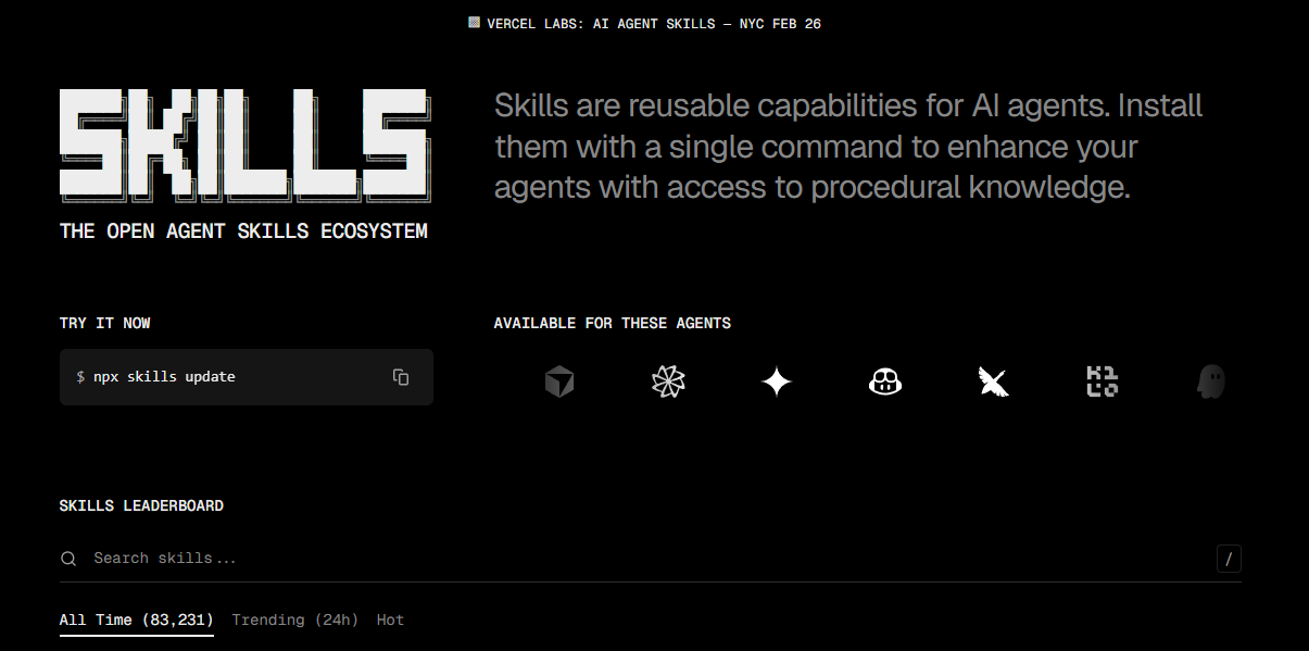 Vercel 发布的一个可视化的 AI Skills 平台--skills.sh ,它基本汇总了所有的公开Skills。