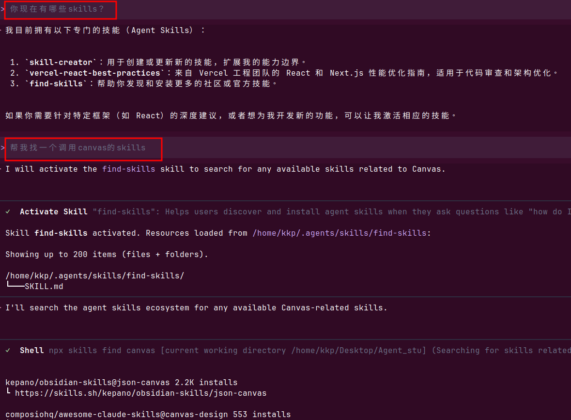可以直接问他有哪些skills,然后用语言描述任务给他就可以调用了,skills都是被动调用的,不需要主动给他指令,这里我让它去找一个调用canvas的skills,它直接调用了find-skills。