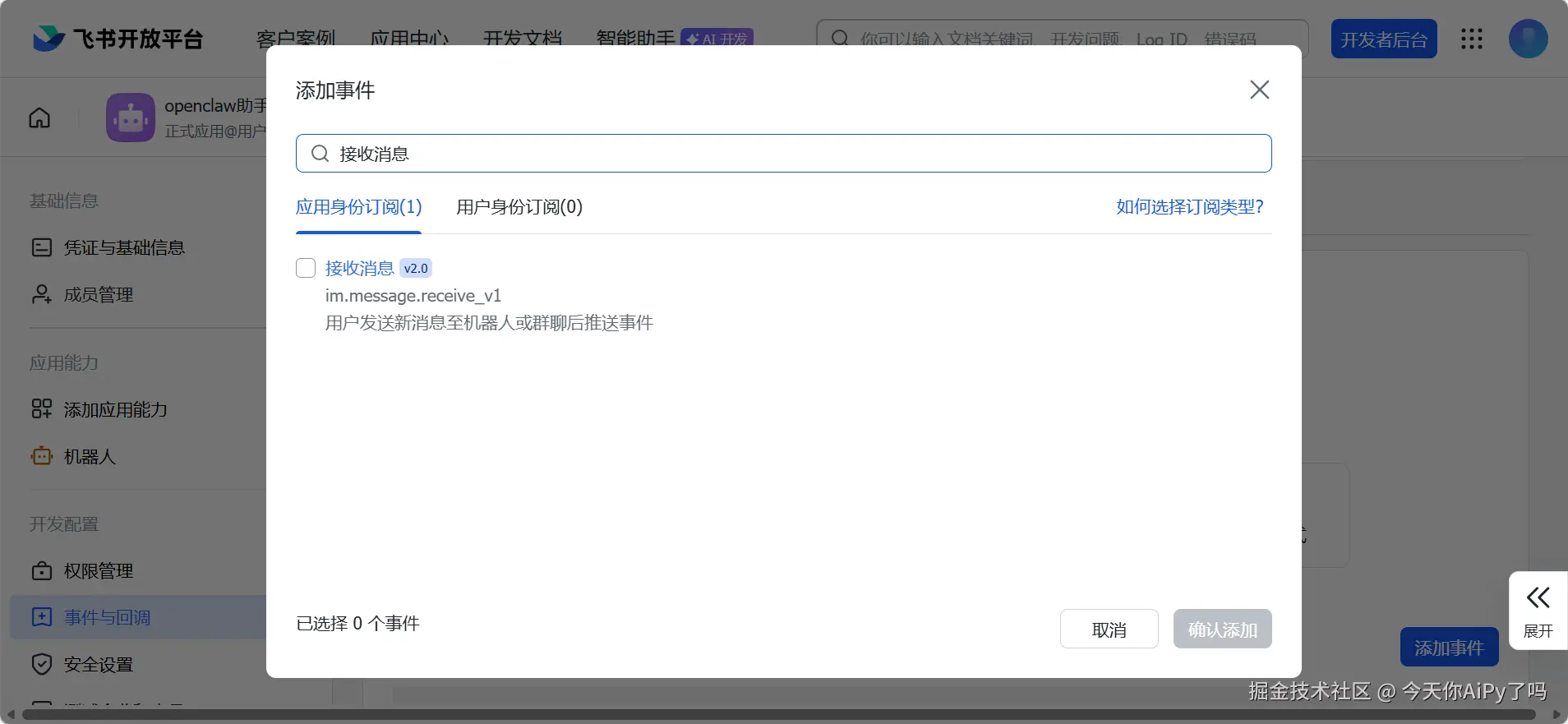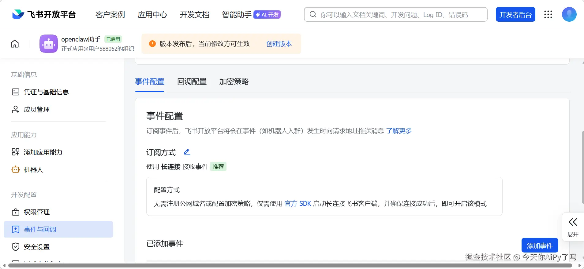 现在进入事件与回调,添加订阅方式,选择事件配置,使用长链接,然后点击保存