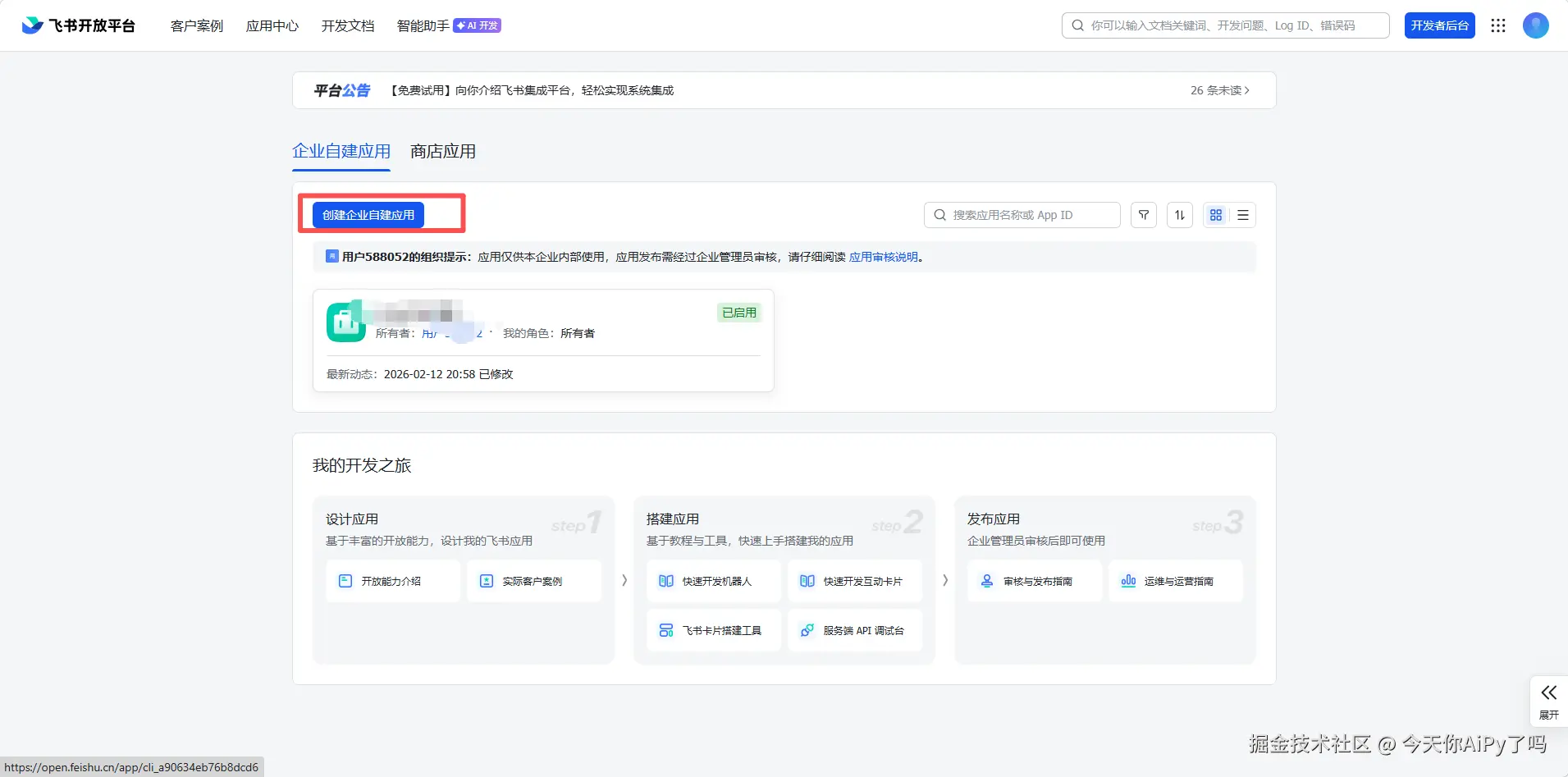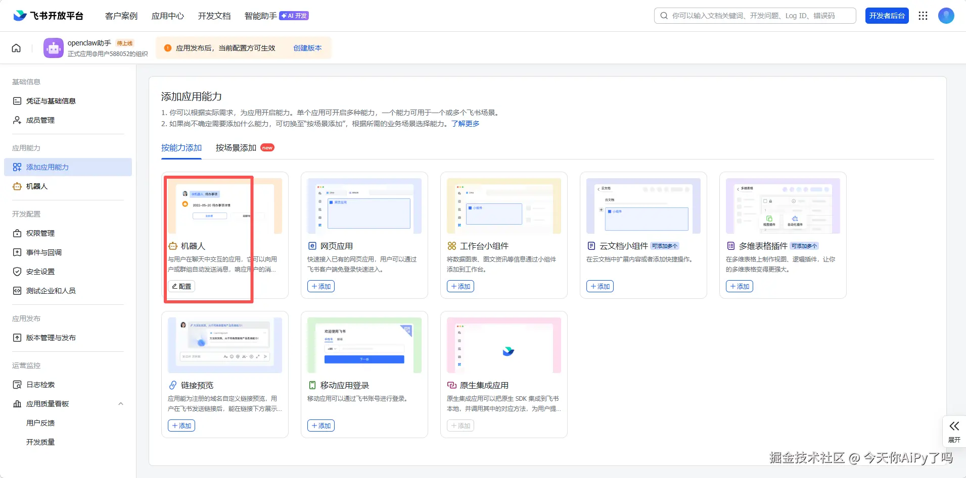 浏览器进入到飞书开发者平台--开发者后台--创建企业自建应用--添加应用能力--选择添加机器人
