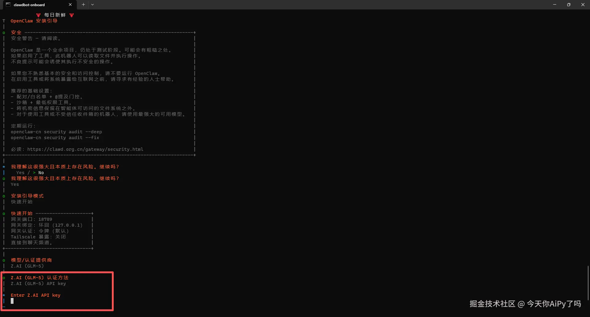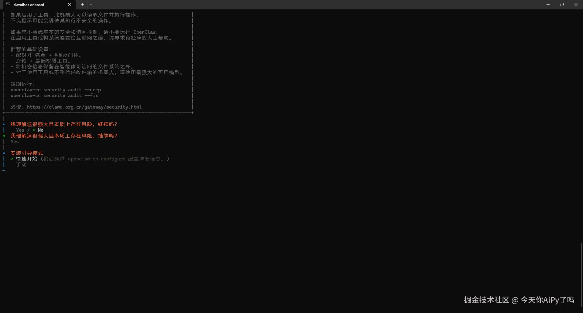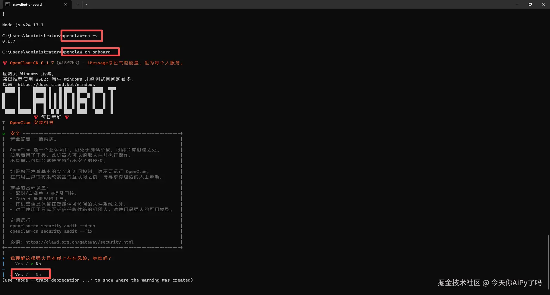 安装完当然要继续配置啦!按照 AiPy 的提示,进入终端(win+R cmd),输入openclaw-cn -v,能查看版本号,就说明安装成功了,然后输入openclaw-cn onboard 进入部署,通过键盘的左右键选择yes+Enter