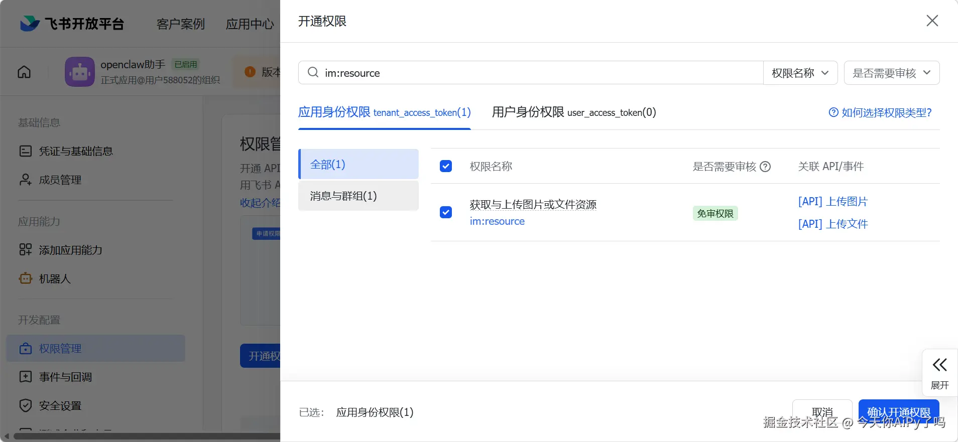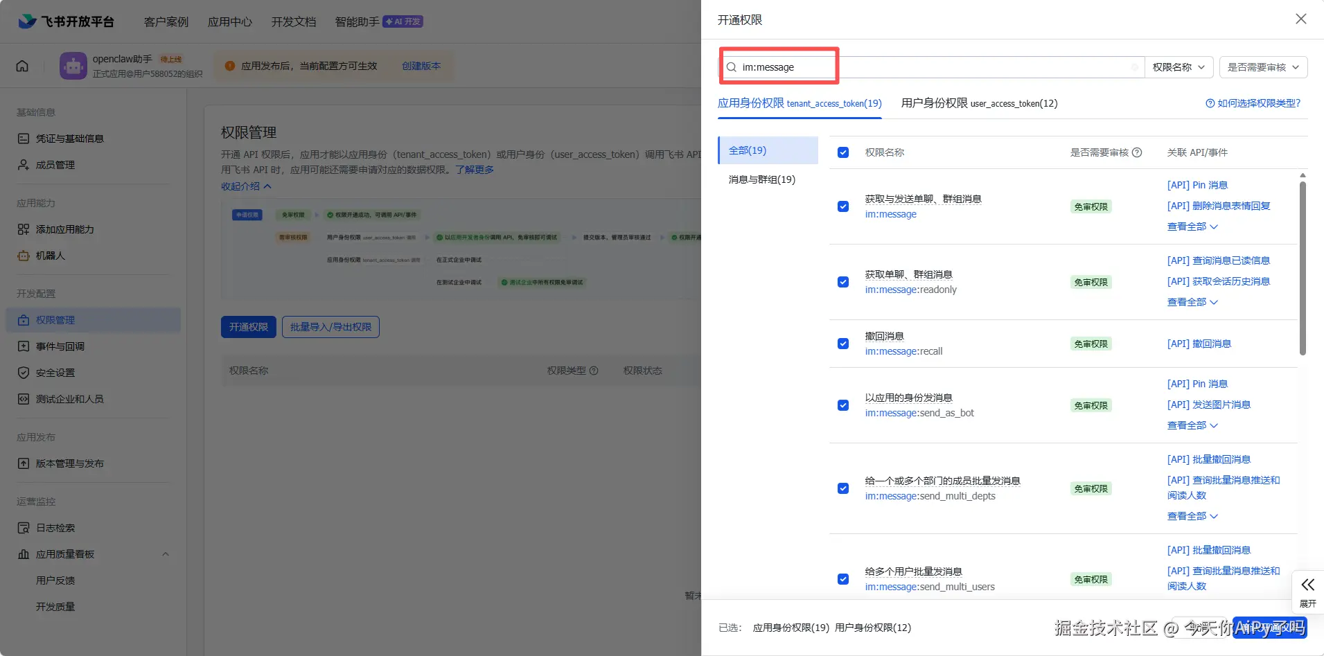 输入 im:message,然后将应用身份权限与用户身份权限全部勾选上
