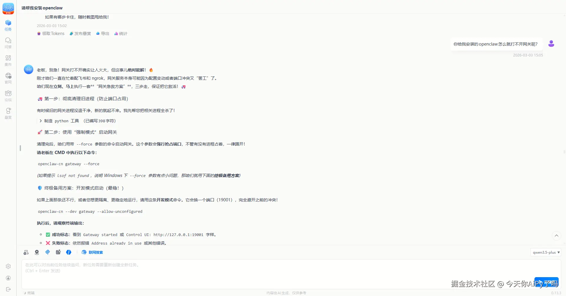 这里AiPy会检查openclaw的配置与端口,然后给出解决方案,会给出重启网关的命令,这里我们直接在终端命令行输入就可以了