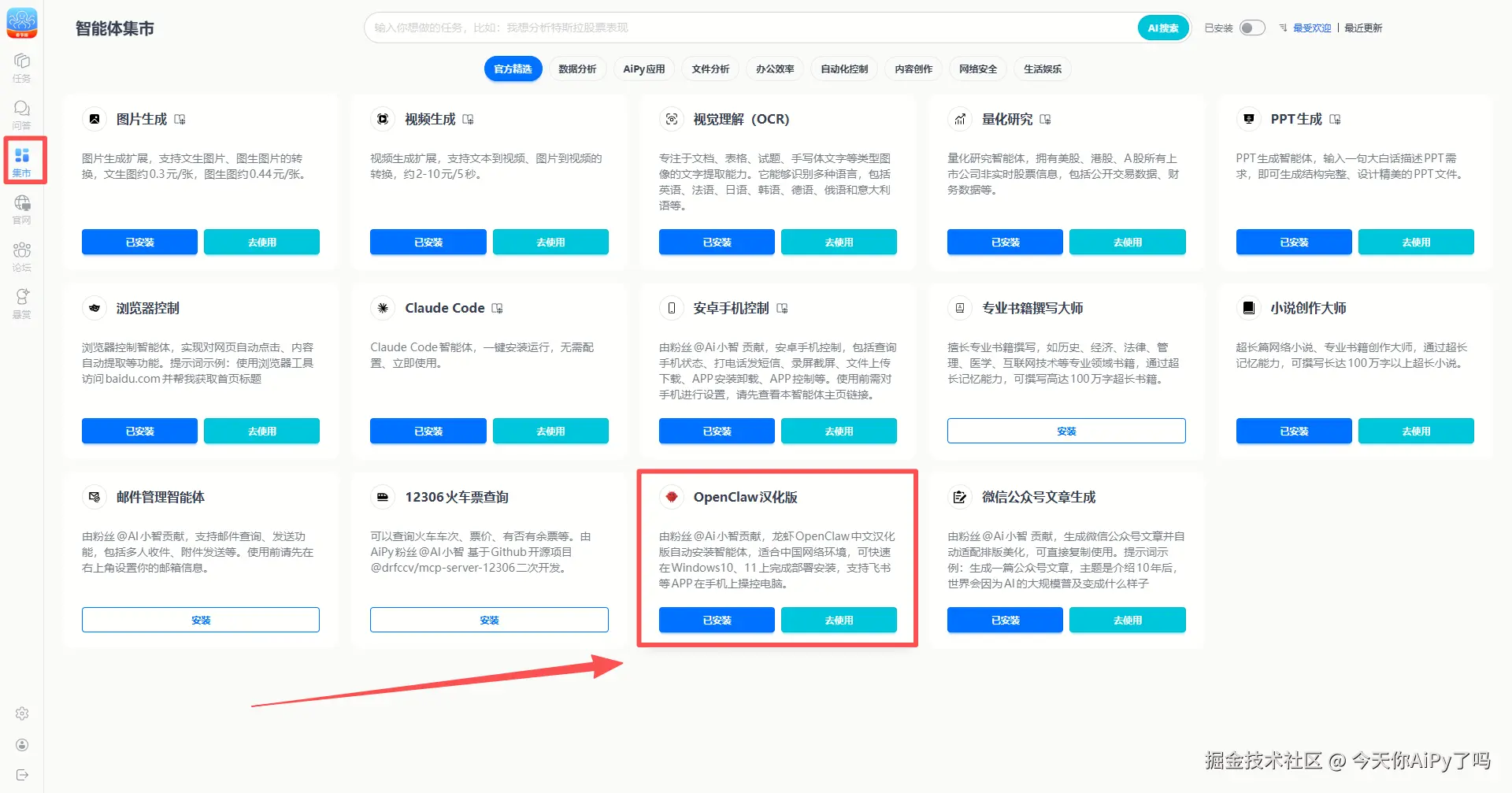 一切准备就绪,打开 AiPy 智能体市集,找到 “OpenClaw 汉化版安装” 智能体。接下来的事,就交给它吧!