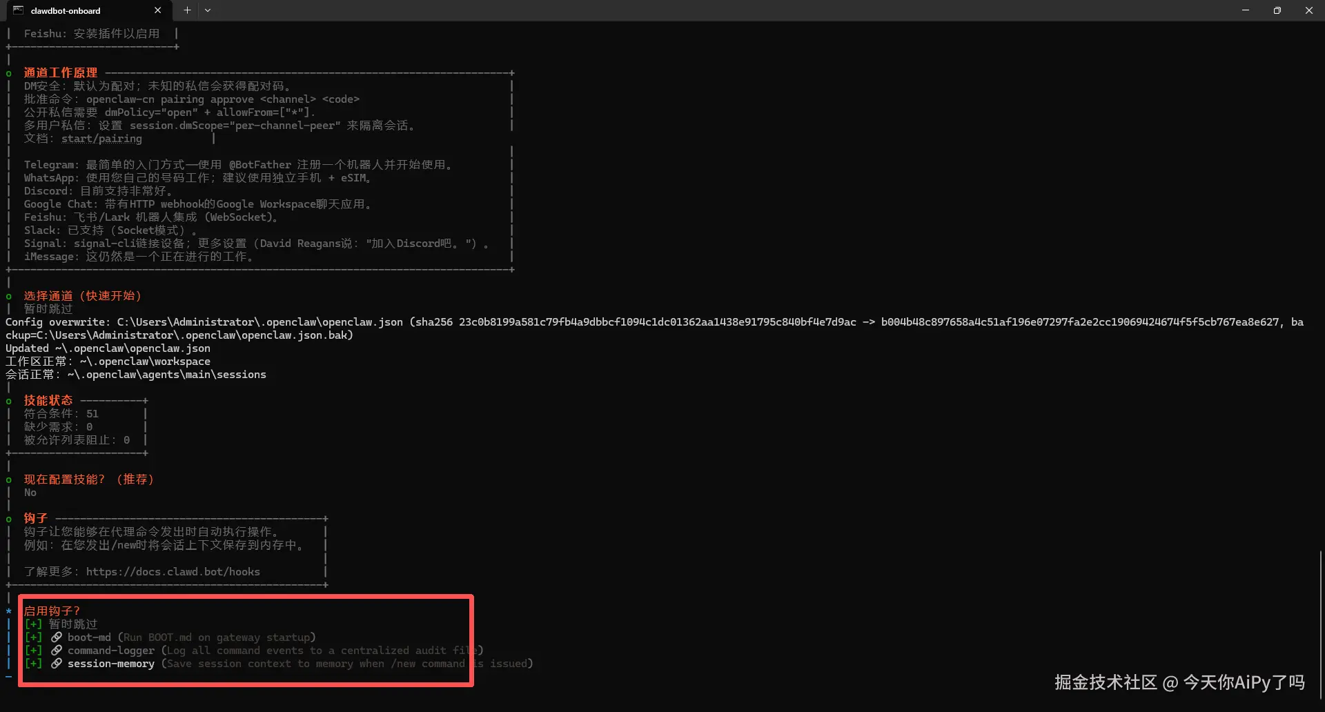 然后会进入到然我们选择配置skill,我这里就直接选择跳过了,因为暂时官方的文档里职能配置50多个skill,后续也可以进入在配置,配置通信我也跳过了,我后面也会将如何配置好后,再进入配置,接入飞书
