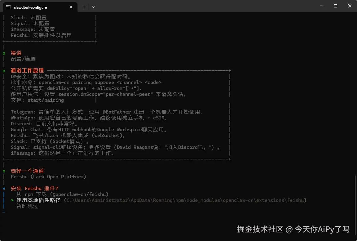 接下来就按照终端上的提示,进入到配置通信工具,选择Feishu,然后选择本地插件路径