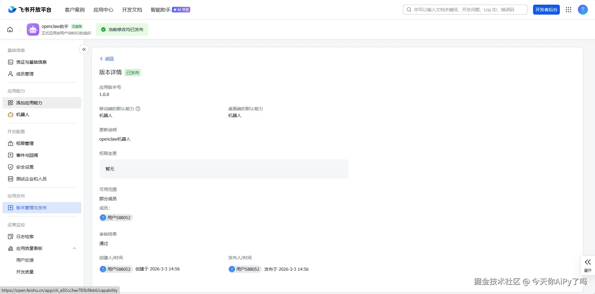 这一步稍微复杂点,要去飞书开发者后台创建应用、配置权限、搞回调地址。本来以为又要折腾半天,结果 AiPy 直接甩给我一份“权限配置清单”,告诉我勾哪几个框。