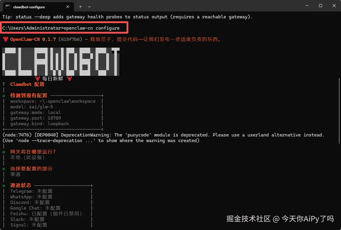 然后回到终端,输入AiPy给我的进入openclaw的配置命令:openclaw-cn configure
