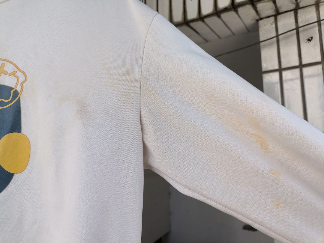 不过那好像也不能叫串色,毕竟一缸白衣服哪来的颜色可以串。感觉就是爆炸盐氧化性太强了,把布料氧化了。从洗衣机里拿出来的时候,一块又一块的淡黄色斑。