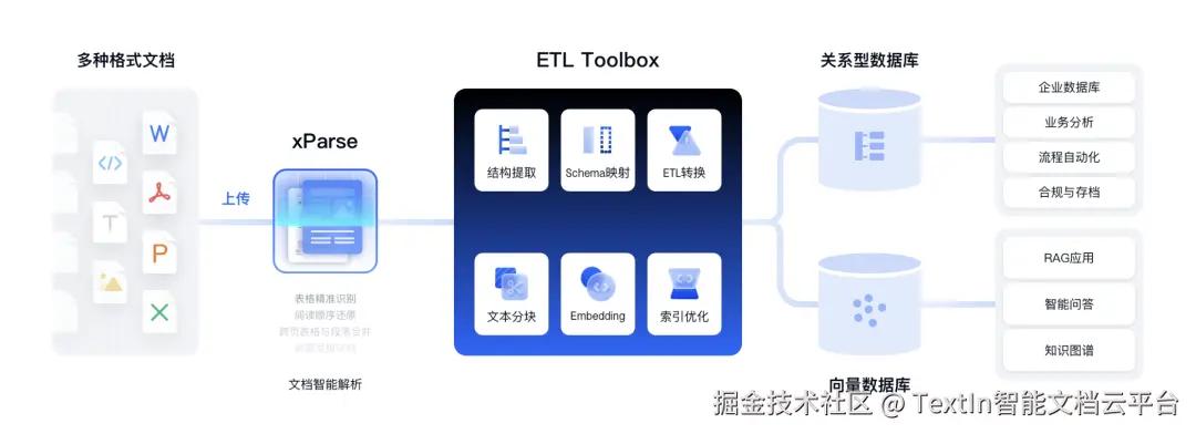 针对企业做RAG时文档解析的核心痛点,TextIn文档解析工具提供了一站式解决方案,作为能为RAG技术提供高质量数据支撑的专业工具,其核心定位是解决RAG落地前的文档解析难题,成为RAG系统高效运行的“数据底座”,助力企业破解解析困境、提升RAG应用效果。