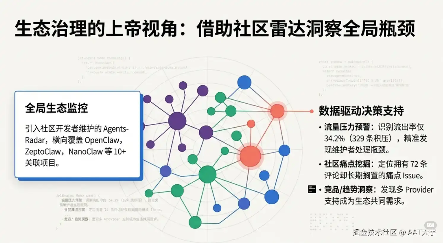 OpenClaw 借用社区工具 Agents-Radar 进行生态监控,是这一支柱的务实起点,未来会发展为实时多项目协同治理。