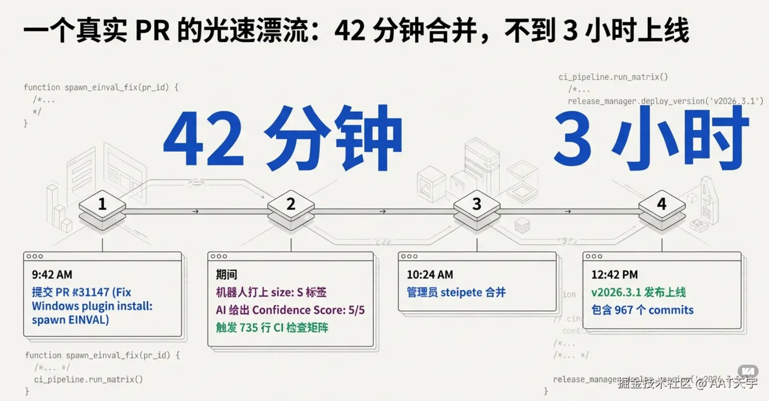 接下来,让我们一起拆解 OpenClaw 的"光速引擎",看看它是如何让一个 PR 在 42 分钟内完成从提交到合并的全流程——并畅想这种研发范式将如何重塑软件开发的未来。