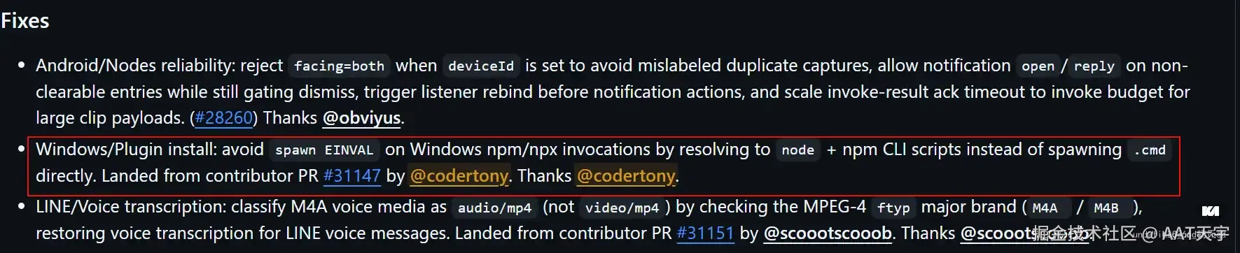 - 我的修复被纳入发布说明:"Windows/Plugin install: avoid spawn EINVAL"