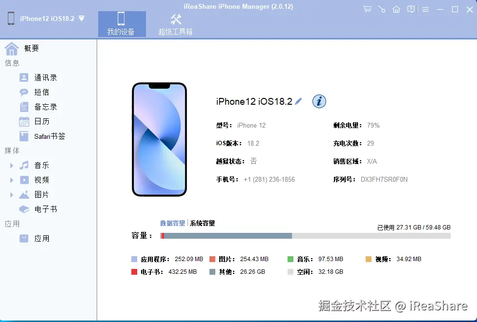 对于觉得 Finder 功能过于局限的用户来说,iReaShare iPhone Manager这款灵活的工具会更合适,它支持“选择性备份”的方式。您可以在界面上预览 iPhone 数据,从而有选择地将联系人、信息、照片、视频、音乐、书籍、备忘录、日历等内容从 iOS 设备备份到 MacBook。