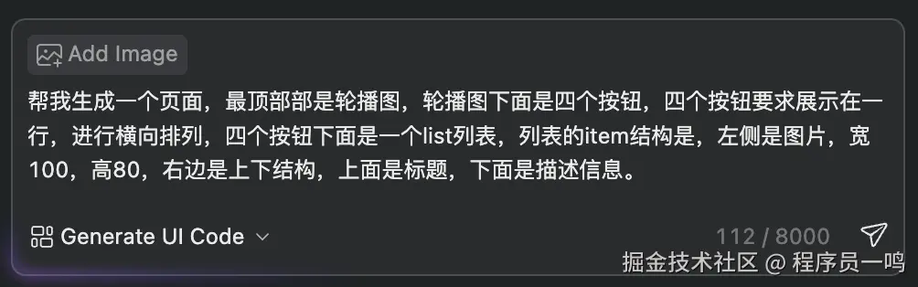 截图上传,点击Add Image按钮后,可以上传一张参考图片,等待片刻后,便可查看实现的效果,这也是CodeGenie更新后最亮眼的功能,简直是程序开发者的福音,以后,写UI代码,只需要把效果图扔给CodeGenie即可。