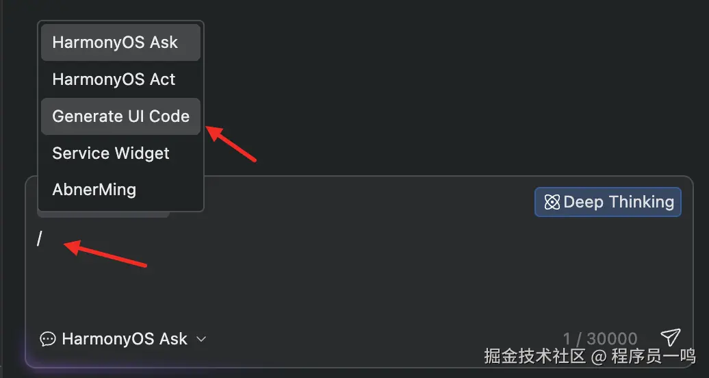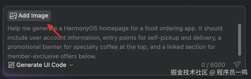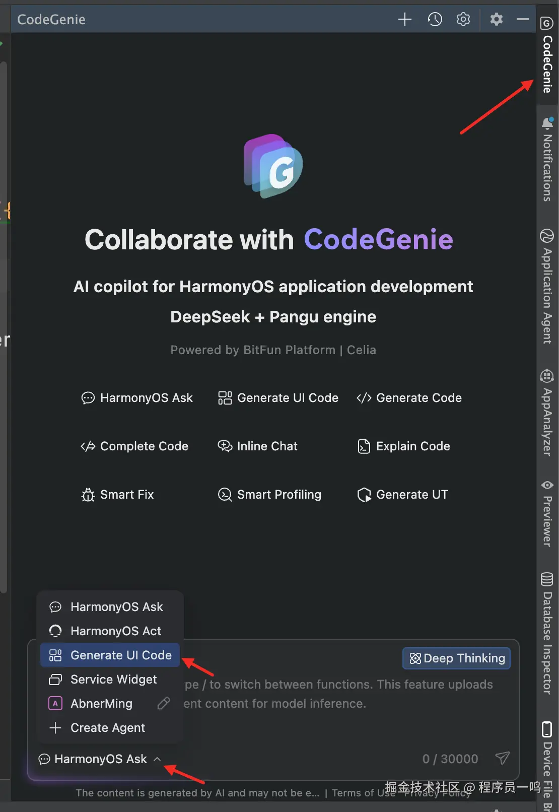 点击DevEcoStudio的右侧中的CodeGenie,输入框左下角选择Generate UI Code。