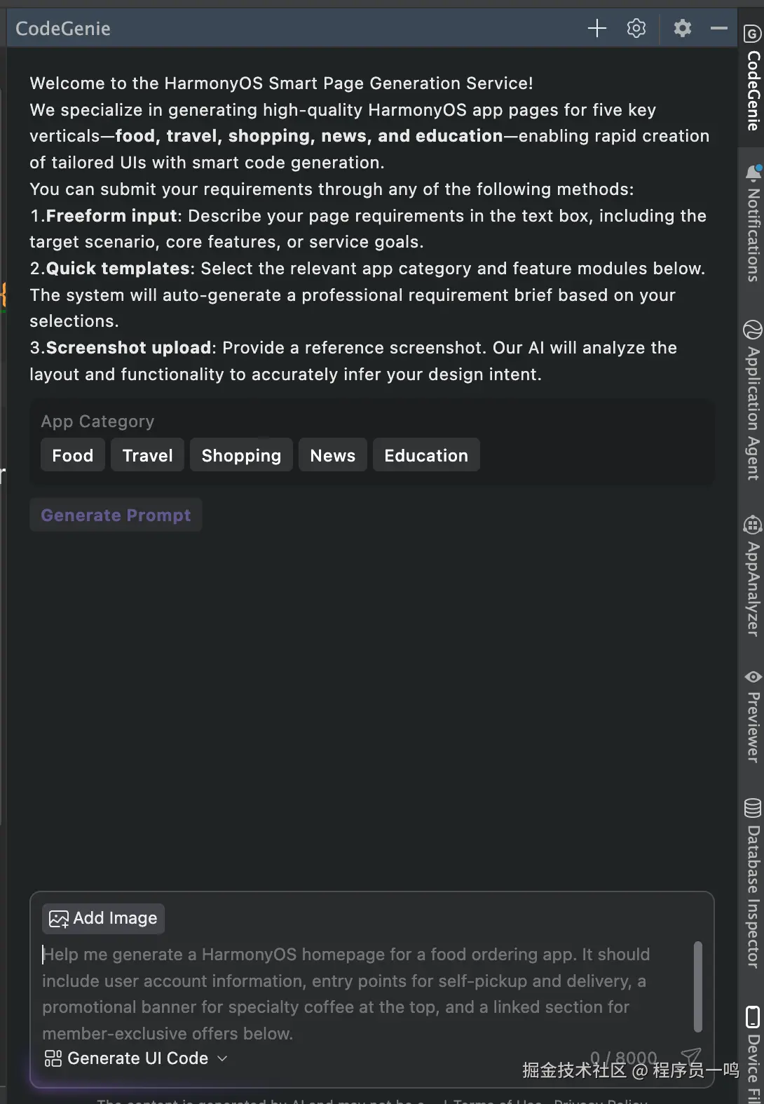 CodeGenie是DevEcoStudio中一个自带的AI工具,在之前的文章中,对于其中的功能做过部分的解读,随着官方的更新迭代,如今的CodeGenie,可以说变得越来越实用,越来越强大,在6.0.0.828及以后的版本中,就新增了一个非常实用的功能,那就是支持根据图片,进行页面功能生成的能力。